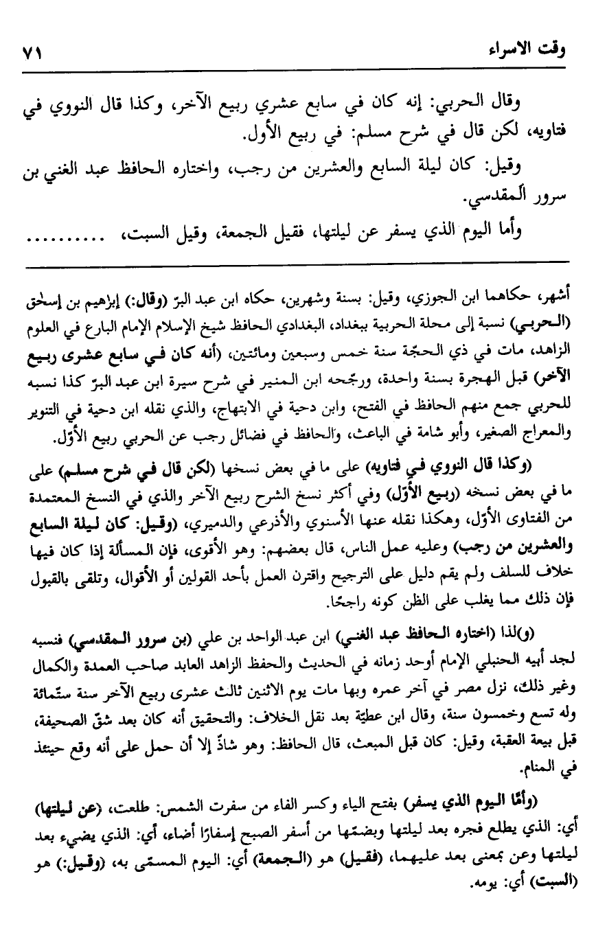 أشهر، حكاهما ابن الجوزي، وقيل: بسنة وشهرين، حكاه ابن عبد البر "وقال": إبراهيم بن إسحاق "الحربي" نسبة إلى محلة الحربية ببغداد، البغدادي شيخ الإسلام الإمام البارع في العلوم الزاهد، مات في ذي الحجة سنة خمس وسبعين ومائتين، "أنه كان في سابع عشري ربيع الآخر" قبل الهجرة بسنة واحدة، ورجحه ابن المنير في شرح سيرة ابن عبد البر كذا نسبه للحربي جمع منهم الحافظ في الفتح، وابن دحية في الابتهاج، والذي نقله ابن دحية في التنوير والمعراج الصغير، وأبو شامة في الباعث، والحافظ في فضائل رجل عن الحربي ربيع الأول.