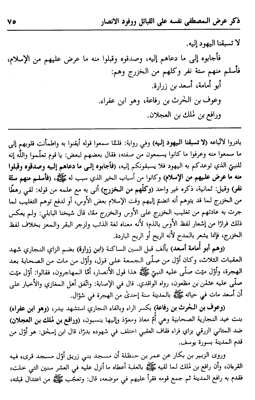 بادروا لاتباعه "لاتسبقنا اليهود إليه" وفي رواية: فلما سمعوا قوله أيقنوا به واطمأنت قلوبهم إلى ما سمعوا منه وعرفوا ما كانوا يسمعون من صفته، فقال بعضهم لبعض: يا قوم تعلموا والله إنه للنبي الذي توعدكم به اليهود فلا يسبقونكم إليه، "فأجابوه إلى ما دعاهم إليه وصدقوه وقبلوا منه ما عرض عليهم من الإسلام" وكانوا من أسباب الخير الذي سبب له -صلى الله عليه وسلم، "فأسلم منهم ستة نفر" وقيل: ثمانية، ذكره غير واحد "وكلهم من الخزرج" أتى به مع علمه من قوله: لقي رهطا من الخزرج لما قد يتوهم أنه انضم إليهم وقت الإسلام بعض الأوس، أو لدفع توهم التغليب لما جرت به عادتهم من تغليب الخزرج على الأوس والخزرج معا، قال شيخنا البابلي: ولم يعكس ذلك فرارا من إشعار لفظ الأوس بالذم؛ لأنه معناه لغة الذئب ولزجر البقر والمعز بخلاف لفظ الخزرج، فإنما يشعر بالمدح لأنه الريح أو الريح الباردة.