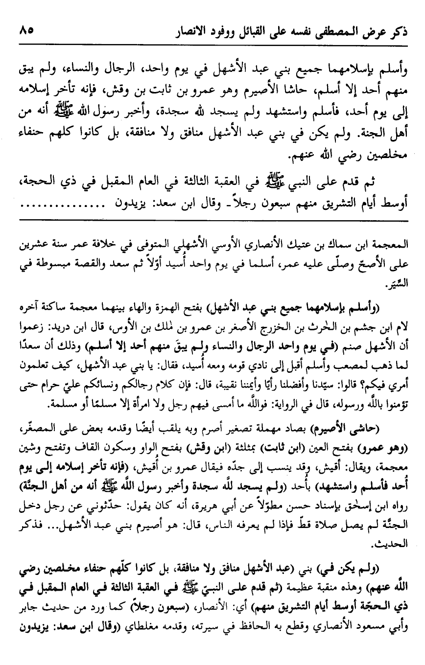 وأسلم بإسلامهم جميع بني عبد الأشهل في يوم واحد، الرجال والنساء، ولم يبق منهم أحد إلا أسلم، حاشا الأصيرم وهو عمرو بن ثابت بن وقش، فإنه تأخر إسلامه إلى يوم أحد، فأسلم واستشهد ولم يسجد لله سجدة، وأخبر رسول الله -صلى الله عليه وسلم- أنه من أهل الجنة. ولم يكن في بني عبد الأشهل منافق ولا منافقة، بل كانوا كلهم حنفاء مخلصين رضي الله عنهم.