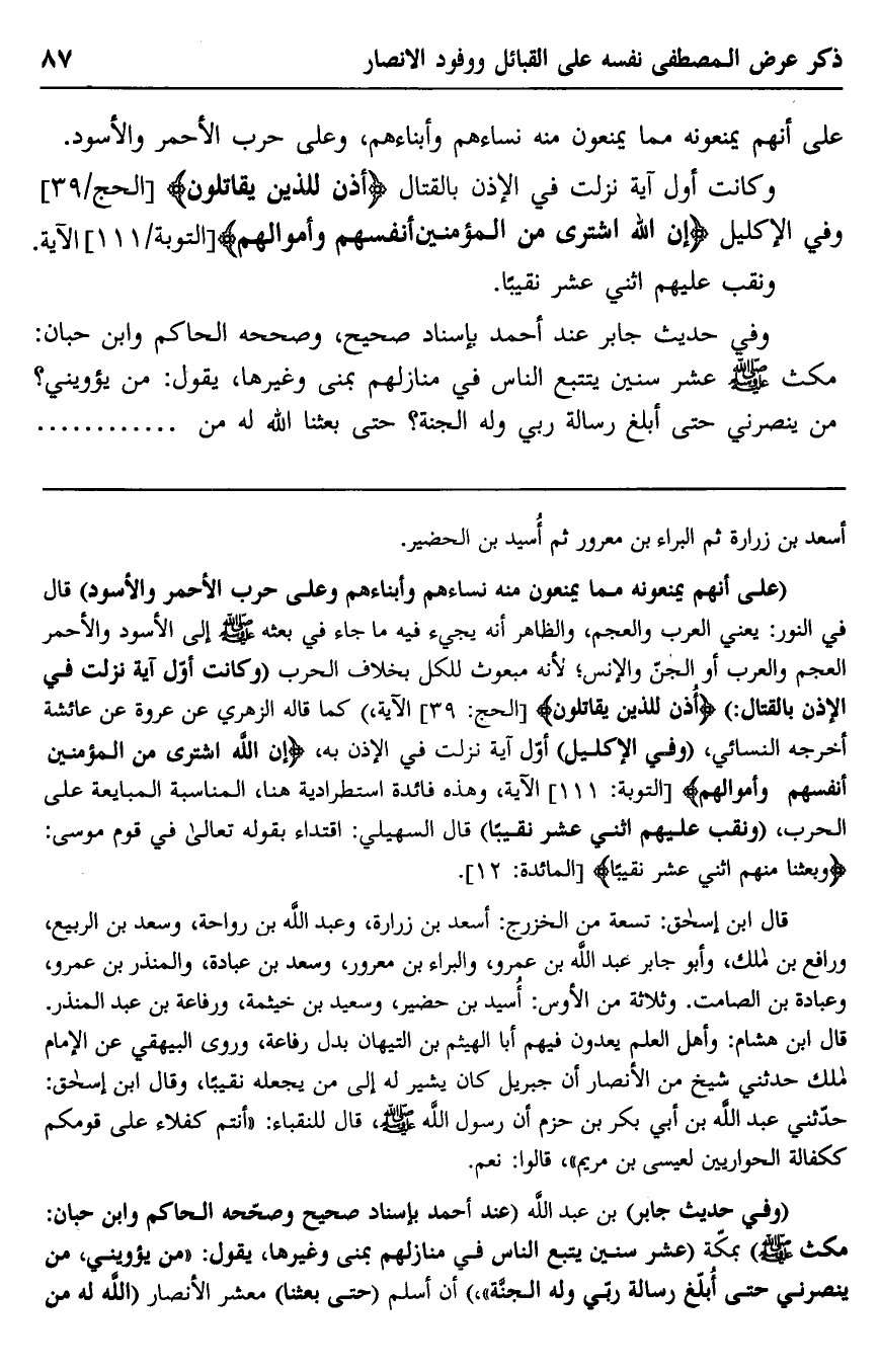 وكانت أول آية نزلت في الإذن بالقتال {أُذِنَ لِلَّذِينَ يُقَاتَلُونَ} [الحج: 39] وفي الإكليل {إِنَّ اللَّهَ اشْتَرَى مِنَ الْمُؤْمِنِينَ أَنْفُسَهُمْ وَأَمْوَالَهُمْ} [التوبة: 111] الآية. ونقب عليهم اثني عشر نقيبا.