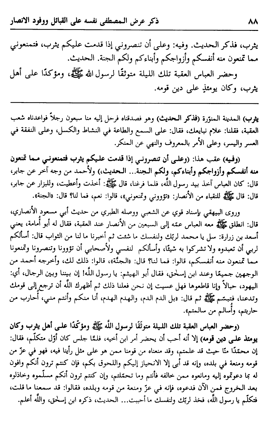 يثرب، فذكر الحديث. وفيه: "وعلى أن تنصروني إذا قدمت عليكم يثرب، فتمنعوني مما تمنعون منه أنفسكم وأزواجكم وأبناءكم ولكم الجنة". الحديث.