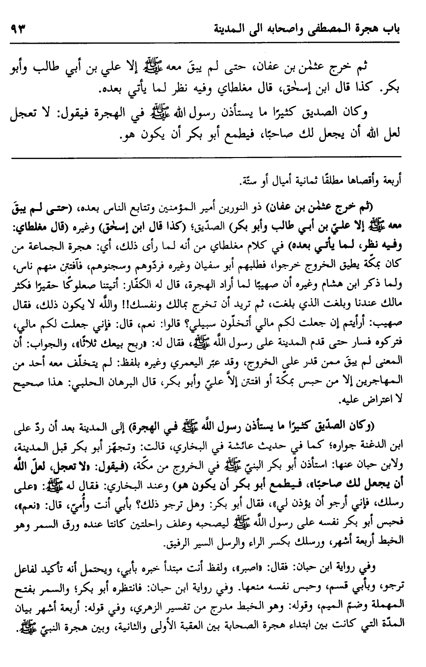 "وكان الصديق كثيرا ما يستأذن رسول الله -صلى الله عليه وسلم- في الهجرة" إلى المدينة بعد أن رد على ابن الدغنة جواره؛ كما في حديث عائشة في البخاري، قالت: وتجهز أبو بكر قبل المدينة، ولابن حبان عنها: استأذن أبو بكر النبي -صلى الله عليه وسلم- في الخروج من مكة، "فيقول: "لا تعجل، لعل الله أن يجعل لك صاحبا"، فيطمع أبو بكر أن يكون هو" وعند البخاري: فقال: له -صلى الله عليه وسلم: "على رسلك، فإني أرجو أن يؤذن لي" فقال أبو بكر: وهل ترجو ذلك؟ بأبي أنت وأمي، قال: "نعم"، فحبس أبو بكر نفسه على رسول الله -صلى الله عليه وسلم- ليصحبه وعلف راحلتين كانتا عنده ورق السمر وهو الخبط أربعة أشهر، ورسلك بكسر الراء والرسل السير الرفيق.