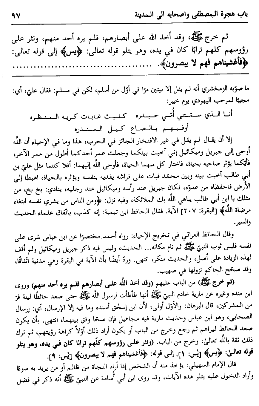 "ثم خرج -صلى الله عليه وسلم" من الباب عليهم "وقد أخذ الله على أبصارهم فلم يره أحد منهم" وروى ابن منده وغيره عن مارية خادم النبي -صلى الله عليه وسلم- أنها طأطأت لرسول الله -صلى الله عليه وسلم- حتى صعد حائطا ليلة فر من المشركين، قال البرهان: والأولى أولى؛ لأن ابن إسحاق أسنده وما فيه إلا الإرسال، أي: إرسال الصحابي، وهو ابن عباس وحديث مارية فيه مجاهيل فإن صحا وفق بينهما، انتهى. بأن يكون صعد الحائط ليراهم ثم رجع وخرج من الباب أو يكون أراد ذلك أولا كراهة رؤيتهم، ثم ترك ذلك ثقة بالله تعالى، وخرج من الباب. "ونثر على رءوسهم كلهم ترابا كان في يده، وهو يتلو قوله تعالى: {يس} [يس: 1] ، إلى قوله: {فَأَغْشَيْنَاهُمْ فَهُمْ لَا يُبْصِرُونَ} [يس: 9] .