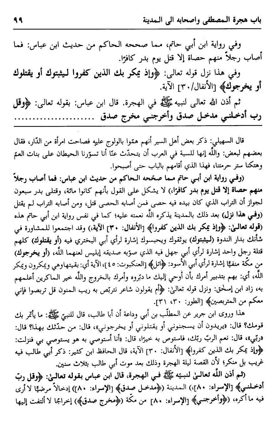"ثم أذن الله تعالى لنبيه -صلى الله عليه وسلم- في الهجرة، قال ابن عباس بقوله تعالى: {وَقُلْ رَبِّ أَدْخِلْنِي} [الإسراء: 80] ، المدينة {مُدْخَلَ صِدْقٍ} [الإسراء: 80] " إدخالا مرضيا لا أرى فيه ما أكره، {وَأَخْرِجْنِي} [الإسراء: 80] من مكة {مُخْرَجَ صِدْقٍ} إخراجا لا ألتفت إليها