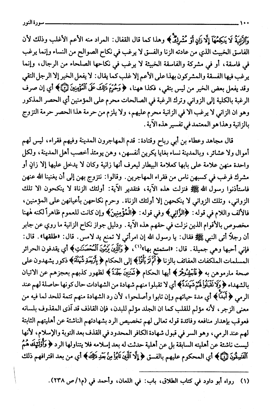 «1» ، وَالَّذِينَ يَرْمُونَ الْمُحْصَناتِ أي يقذفون الحرائر المسلمات المكلفات العفائف بالزنا ثُمَّ لَمْ يَأْتُوا إلى الحكام بِأَرْبَعَةِ شُهَداءَ ذكور يشهدون على صحة ما رموهن به فَاجْلِدُوهُمْ أيها الحكام ثَمانِينَ جَلْدَةً لظهور كذبهم بعجزهم عن الإتيان بالشهداء وَلا تَقْبَلُوا لَهُمْ شَهادَةً أي لا تقبلوا منهم شهادة من الشهادات حال كونها حاصلة لهم عند الرمي أَبَداً أي مدة حياتهم وإن تابوا وأصلحوا، لأن رد الشهادة منهم تتمة للحد لما فيه من معنى الزجر، لأنه مؤلم للقلب كما ان الجلد مؤلم للبدن، فإن القاذف قد آذى المقذوف بلسانه فعوقب بإهدار منافعه وفائدة قوله تعالى لهم تخصيص الرد بشهادتهم الناشئة عن أهليتهم الثابتة لهم عند الرمي، وهو السر في قبول شهادة الكافر المحدود في القذف بعد التوبة والإسلام، لأنها ليست ناشئة عن أهليته السابقة بل عن أهلية حدثت له بعد إسلامه فلا يتناولها الرد وَأُولئِكَ هُمُ الْفاسِقُونَ (4) أي المحكوم عليهم بالفسق إِلَّا الَّذِينَ تابُوا مِنْ بَعْدِ ذلِكَ أي من بعد اقترافهم ذلك