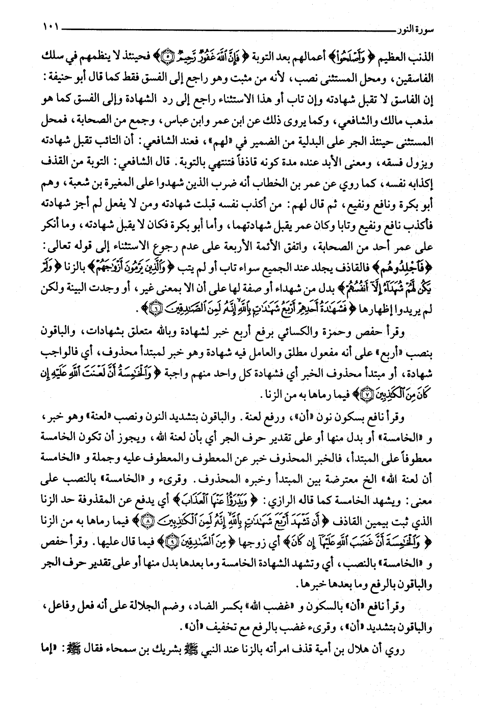 وقرأ نافع بسكون نون «أن» ، ورفع لعنة. والباقون بتشديد النون ونصب «لعنة» وهو خبر، و «الخامسة» أو بدل منها أو على تقدير حرف الجر أي بأن لعنة الله، ويجوز أن تكون الخامسة معطوفا على المبتدأ، فالخبر المحذوف خبر عن المعطوف والمعطوف عليه وجملة و «الخامسة أن لعنة الله» إلخ معترضة بين المبتدأ وخبره المحذوف. وقرئ و «الخامسة» بالنصب على معنى: ويشهد الخامسة كما قاله الرازي: وَيَدْرَؤُا عَنْهَا الْعَذابَ أي يدفع عن المقذوفة حد الزنا الذي ثبت بيمين القاذف أَنْ تَشْهَدَ أَرْبَعَ شَهاداتٍ بِاللَّهِ إِنَّهُ لَمِنَ الْكاذِبِينَ (8) فيما رماها به من الزنا وَالْخامِسَةَ أَنَّ غَضَبَ اللَّهِ عَلَيْها إِنْ كانَ أي زوجها مِنَ الصَّادِقِينَ (9) فيما قال عليها. وقرأ حفص و «الخامسة» بالنصب، أي وتشهد الشهادة الخامسة وما بعدها بدل منها أو على تقدير حرف الجر والباقون بالرفع وما بعدها خبرها.