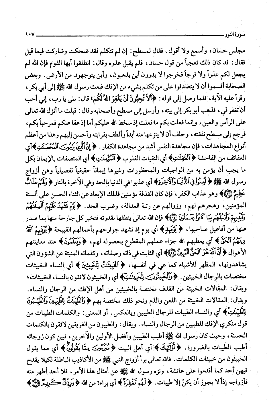 مجلس حسان، وأسمع ولا أقول. فقال لمسطح: إن لم تتكلم فقد ضحكت وشاركت فيما قيل فقال: قد كان ذلك تعجبا من قول حسان، فلم يقبل عذره وقال: انطلقوا أيها القوم فإن الله لم يجعل لكم عذرا ولا فرجا فخرجوا لا يدرون أين يذهبون، وأين يتوجهون من الأرض. وبعض الصحابة أقسموا أن لا يتصدقوا على من تكلم بشيء من الإفك فبعث رسول الله صلّى الله عليه وسلّم إلى أبي بكر، وقرأ عليه الآية، فلما وصل إلى قوله: أَلا تُحِبُّونَ أَنْ يَغْفِرَ اللَّهُ لَكُمْ» قال: بلى يا رب، إني أحب أن تغفر لي، فذهب أبو بكر إلى بيته، وأرسل إلى مسطح وأصحابه وقال: قبلت ما أنزل الله تعالى على الرأس والعين، وإنما فعلت بكم ما فعلت إذ سخط الله عليكم أما إذ عفا عنكم فمرحبا بكم، فرجع إلى مسطح نفقته، وحلف أن لا ينزعها منه أبدا وألطف بقرابته وأحسن إليهم وهذا من أعظم أنواع المجاهدات، فإن مجاهدة النفس أشد من مجاهدة الكفار. إِنَّ الَّذِينَ يَرْمُونَ الْمُحْصَناتِ أي العفائف من الفاحشة الْغافِلاتِ أي النقيات القلوب الْمُؤْمِناتِ أي المتصفات بالإيمان بكل ما يجب أن يؤمن به من الواجبات والمحظورات وغيرها إيمانا حقيقيا تفصيليا وهن أزواج رسول الله صلّى الله عليه وسلّم لُعِنُوا فِي الدُّنْيا وَالْآخِرَةِ أي عذبوا في الدنيا بالحد وفي الآخرة بالنار وَلَهُمْ عَذابٌ عَظِيمٌ (23) وهو عذاب الكفر، فإن كان القذفة مؤمنين فذلك الإبعاد عن الثناء الحسن على ألسنة المؤمنين، وهجرهم لهم، وزوالهم عن رتبة العدالة، وضرب الحد. يَوْمَ تَشْهَدُ عَلَيْهِمْ أَلْسِنَتُهُمْ وَأَيْدِيهِمْ وَأَرْجُلُهُمْ بِما كانُوا يَعْمَلُونَ (24) فإن الله تعالى ينطقها بقدرته فتخبر كل جارحة منها بما صدر عنها من أفاعيل صاحبها، يَوْمَئِذٍ أي يوم إذ تشهد جوارحهم بأعمالهم القبيحة يُوَفِّيهِمُ اللَّهُ دِينَهُمُ الْحَقَّ أي يعطيهم الله جزاء عملهم المقطوع بحصوله لهم، وَيَعْلَمُونَ عند معاينتهم الأهوال أَنَّ اللَّهَ هُوَ الْحَقُّ الْمُبِينُ (25) أي الثابت في ذاته وصفاته، وكلماته المنبئة عن الشؤون التي يشاهدونها، المظهر للأشياء كما هي في أنفسها، الْخَبِيثاتُ لِلْخَبِيثِينَ أي النساء الخبيثات مختصات بالرجال الخبيثين. وَالْخَبِيثُونَ لِلْخَبِيثاتِ أي والخبيثون لائقون بالنساء الخبيثات ويقال: المقالات الخبيثة من القذف مختصة بالخبيثين من أهل الإفك من الرجال والنساء.