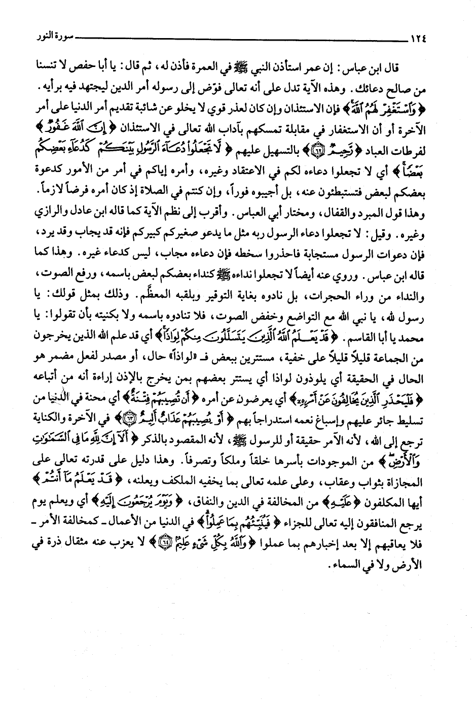 وهذا قول المبرد والقفال، ومختار أبي العباس. وأقرب إلى نظم الآية كما قاله ابن عادل والرازي وغيره. وقيل: لا تجعلوا دعاء الرسول ربه مثل ما يدعو صغيركم كبيركم فإنه قد يجاب وقد يرد، فإن دعوات الرسول مستجابة فاحذروا سخطه فإن دعاءه مجاب، ليس كدعاء غيره. وهذا كما قاله ابن عباس. وروي عنه أيضا لا تجعلوا نداءه صلّى الله عليه وسلّم كنداء بعضكم لبعض باسمه، ورفع الصوت، والنداء من وراء الحجرات، بل نادوه بغاية التوقير وبلقبه المعظّم. وذلك بمثل قولك: يا رسول لله، يا نبي الله مع التواضع وخفض الصوت، فلا تنادوه باسمه ولا بكنيته بأن تقولوا: يا محمد يا أبا القاسم. قَدْ يَعْلَمُ اللَّهُ الَّذِينَ يَتَسَلَّلُونَ مِنْكُمْ لِواذاً أي قد علم الله الذين يخرجون من الجماعة قليلا قليلا على خفية، مستترين ببعض ف «لواذا» حال، أو مصدر لفعل مضمر هو الحال في الحقيقة أي يلوذون لواذا أي يستتر بعضهم بمن يخرج بالإذن إراءة أنه من أتباعه فَلْيَحْذَرِ الَّذِينَ يُخالِفُونَ عَنْ أَمْرِهِ أي يعرضون عن أمره أَنْ تُصِيبَهُمْ فِتْنَةٌ أي محنة في الدنيا من تسليط جائر عليهم وإسباغ نعمه استدراجا بهم أَوْ يُصِيبَهُمْ عَذابٌ أَلِيمٌ (63) في الآخرة والكناية ترجع إلى الله، لأنه الآمر حقيقة أو للرسول صلّى الله عليه وسلّم، لأنه المقصود بالذكر أَلا إِنَّ لِلَّهِ ما فِي السَّماواتِ وَالْأَرْضِ من الموجودات بأسرها خلقا وملكا وتصرفا. وهذا دليل على قدرته تعالى على المجازاة بثواب وعقاب، وعلى علمه تعالى بما يخفيه المكلف ويعلنه، قَدْ يَعْلَمُ ما أَنْتُمْ أيها المكلفون عَلَيْهِ من المخالفة في الدين والنفاق، وَيَوْمَ يُرْجَعُونَ إِلَيْهِ أي ويعلم يوم يرجع المنافقون إليه تعالى للجزاء فَيُنَبِّئُهُمْ بِما عَمِلُوا في الدنيا من الأعمال- كمخالفة الأمر- فلا يعاقبهم إلا بعد إخبارهم بما عملوا وَاللَّهُ بِكُلِّ شَيْءٍ عَلِيمٌ (64) لا يعزب عنه مثقال ذرة في الأرض ولا في السماء.