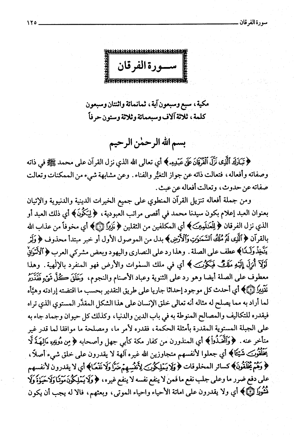 ومن جملة أفعاله تنزيل القرآن المنطوي على جميع الخيرات الدينية والدنيوية والإتيان بعنوان العبد إعلام بكون سيدنا محمد في أقصى مراتب العبودية، لِيَكُونَ أي ذلك العبد أو الذي نزل الفرقان لِلْعالَمِينَ أي المكلفين من الثقلين نَذِيراً (1) أي مخوفا من عذاب الله بالقرآن الَّذِي لَهُ مُلْكُ السَّماواتِ وَالْأَرْضِ بدل من الموصول الأول أو خبر مبتدأ محذوف وَلَمْ يَتَّخِذْ وَلَداً عطف على الصلة. وهذا رد على النصارى واليهود وبعض مشركي العرب الْأَسْواقِ لَوْلا أُنْزِلَ إِلَيْهِ مَلَكٌ فَيَكُونَ أي في ملك السموات والأرض فهو المنفرد بالإلهية. وهذا معطوف على الصلة أيضا وهو رد على الثنوية وعباد الأصنام والنجوم، وَخَلَقَ كُلَّ شَيْءٍ فَقَدَّرَهُ تَقْدِيراً (2) أي أحدث كل موجود إحداثا جاريا على طريق التقدير بحسب ما اقتضته إرادته وهيّأه لما أراد به مما يصلح له مثاله أنه تعالى خلق الإنسان على هذا الشكل المقدّر المستوي الذي تراه فيقدره للتكاليف والمصالح المنوطة به في باب الدين والدنيا، وكذلك كل حيوان وجماد جاء به على الجبلة المستوية المقدرة بأمثلة الحكمة، فقدره لأمر ما، ومصلحة ما موافقا لما قدر غير متأخر عنه. وَاتَّخَذُوا أي المنذرون من كفار مكة كأبي جهل وأصحابه مِنْ دُونِهِ آلِهَةً لا يَخْلُقُونَ شَيْئاً أي جعلوا لأنفسهم متجاوزين الله غيره آلهة لا يقدرون على خلق شيء أصلا، وَهُمْ يُخْلَقُونَ كسائر المخلوقات وَلا يَمْلِكُونَ لِأَنْفُسِهِمْ ضَرًّا وَلا نَفْعاً أي لا يقدرون لأنفسهم على دفع ضرر ما وعلى جلب نفع ما فمن لا ينفع نفسه لا ينفع غيره، وَلا يَمْلِكُونَ مَوْتاً وَلا حَياةً وَلا نُشُوراً (3) أي ولا يقدرون على اماتة الأحياء واحياء الموتى، وبعثهم، فالا له يجب أن يكون