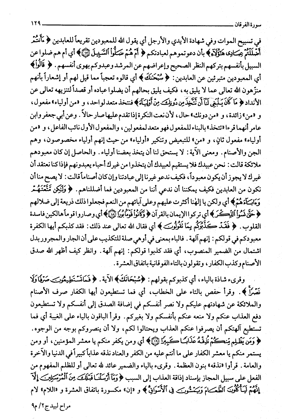 في تسبيح الموات وفي شهادة الأيدي والأرجل أي يقول الله للمعبودين تقريعا للعابدين أَأَنْتُمْ أَضْلَلْتُمْ عِبادِي هؤُلاءِ بأن دعوتموهم لعبادتكم أَمْ هُمْ ضَلُّوا السَّبِيلَ (17) أي أم هم ضلوا عن السبيل بأنفسهم بتركهم النظر الصحيح وإعراضهم عن المرشد وعبدوكم بهوى أنفسهم. قالُوا أي المعبودين متبرئين عن العابدين: سُبْحانَكَ أي قالوه تعجبا مما قيل لهم أو إشعارا بأنهم منزّهون الله تعالى عما لا يليق به، فكيف يليق بحالهم أن يضلوا عباده أو قصدا لتنزيهه تعالى عن الأنداد ما كانَ يَنْبَغِي لَنا أَنْ نَتَّخِذَ مِنْ دُونِكَ مِنْ أَوْلِياءَ فنتخذ متعد لواحد، و «من أولياء» مفعول، و «من» زائدة، و «من دونك» حال، لأن نعت النكرة إذا تقدم عليها صار حالا. وعن أبي جعفر وابن عامر أنهما قرءا «تتخذ» بالبناء للمفعول فهو متعد لمفعولين، والمفعول الأول نائب الفاعل، و «من أولياء» مفعول ثان، و «من» للتبعيض وتنكير «أولياء» من حيث إنهم أولياء مخصوصون، وهم الجن والأصنام. ومعنى الآية: لا يستحق لنا أن يتخذ بعضنا أولياء. والحاصل إن كان معبودهم ملائكة قالت: نحن عبيدك فلا يستقيم لعبيدك أن يتخذوا من غيرك أحباء يعبدونهم فإذا كنا نعتقد أن غيرك لا يجوز أن يكون معبودا، فكيف ندعو غيرنا إلى عبادتنا وإن كان أصناما قالت: لا يصح منا أن نكون من العابدين فكيف يمكننا أن ندعي أننا من المعبودين فما أضللناهم. وَلكِنْ مَتَّعْتَهُمْ وَآباءَهُمْ أي ولكن يا إلهنا أكثرت عليهم وعلى آبائهم من النعم فجعلوا ذلك ذريعة إلى ضلالهم حَتَّى نَسُوا الذِّكْرَ أي تركوا الإيمان بالقرآن وَكانُوا قَوْماً بُوراً (18) أي وصاروا قوما هالكين فاسدة القلوب. فَقَدْ كَذَّبُوكُمْ بِما تَقُولُونَ أي فقال الله تعالى عند ذلك: فقد كذبكم أيها الكفرة معبودكم في قولكم: إنهم آلهة. فالباء بمعنى في أو هي صلة للتكذيب على أن الجار والمجرور بدل اشتمال من الضمير المنصوب، أي فقد كذبوا قولكم: إنهم آلهة. وانظر كيف أظهر الله صدق الأصنام وكذب الكفار، وتقولون بالتاء الفوقانية باتفاق العشرة.