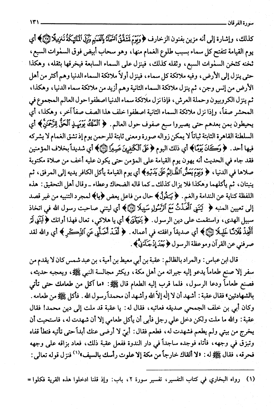قال ابن عباس: والمراد بالظالم: عقبة بن أبي معيط بن أمية، بن عبد شمس كان لا يقدم من سفر إلا صنع طعاما يدعو إليه جيرانه من أهل مكة، ويكثر مجالسة النبي صلّى الله عليه وسلّم، ويعجبه حديثه، فصنع طعاما ودعا الرسول، فلما قرب إليه الطعام قال صلّى الله عليه وسلّم: «ما آكل من طعامك حتى تأتي بالشهادتين» فقال عقبة: أشهد أن لا إله إلّا الله وأشهد أن محمدا رسول الله. فأكل صلّى الله عليه وسلّم من طعامه.