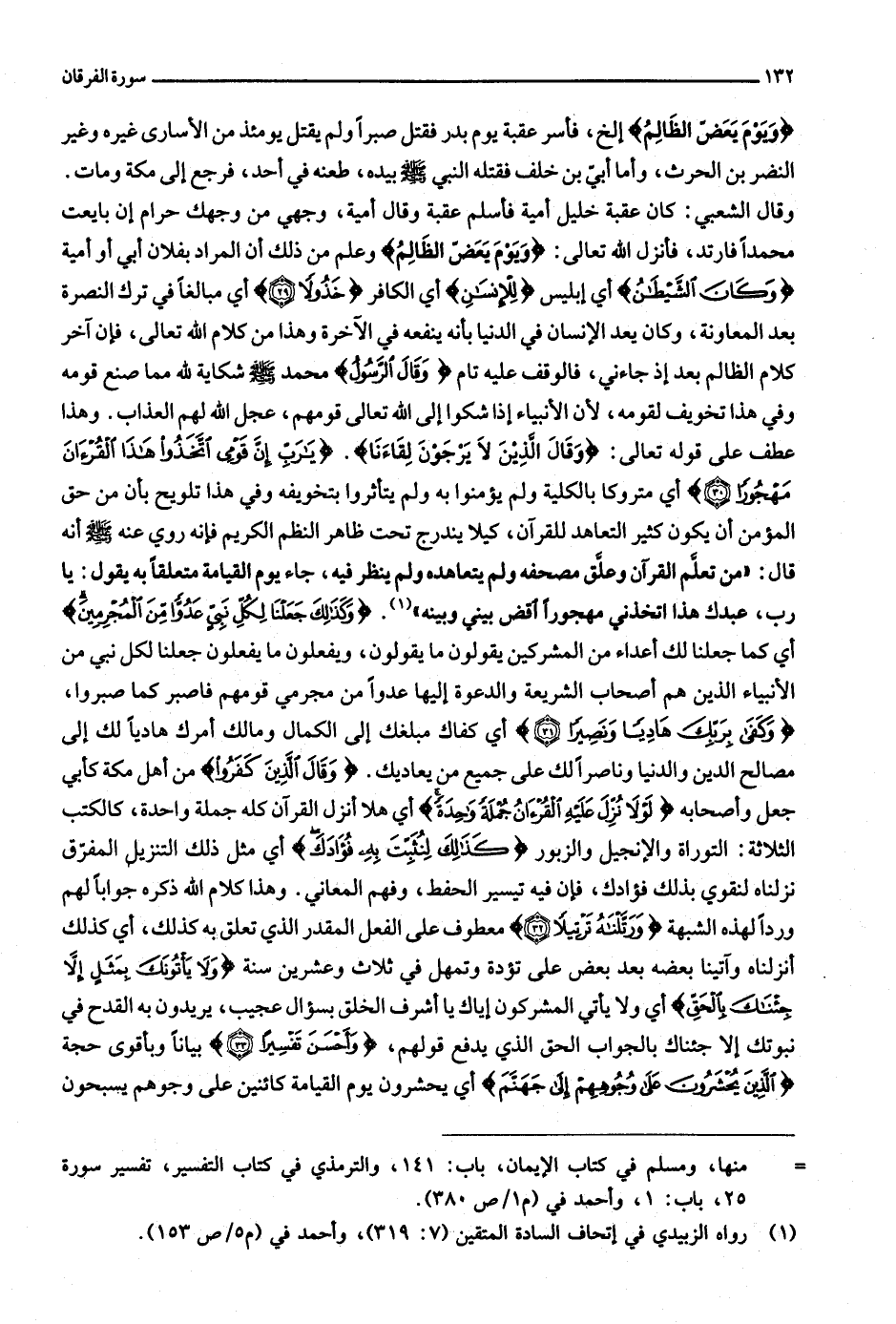 وَكَذلِكَ جَعَلْنا لِكُلِّ نَبِيٍّ عَدُوًّا مِنَ الْمُجْرِمِينَ أي كما جعلنا لك أعداء من المشركين يقولون ما يقولون، ويفعلون ما يفعلون جعلنا لكل نبي من الأنبياء الذين هم أصحاب الشريعة والدعوة إليها عدوا من مجرمي قومهم فاصبر كما صبروا، وَكَفى بِرَبِّكَ هادِياً وَنَصِيراً (31) أي كفاك مبلغك إلى الكمال ومالك أمرك هاديا لك إلى مصالح الدين والدنيا وناصرا لك على جميع من يعاديك. وَقالَ الَّذِينَ كَفَرُوا من أهل مكة كأبي جعل وأصحابه لَوْلا نُزِّلَ عَلَيْهِ الْقُرْآنُ جُمْلَةً واحِدَةً أي هلا أنزل القرآن كله جملة واحدة، كالكتب الثلاثة: التوراة والإنجيل والزبور كَذلِكَ لِنُثَبِّتَ بِهِ فُؤادَكَ أي مثل ذلك التنزيل المفرّق نزلناه لنقوي بذلك فؤادك، فإن فيه تيسير الحفظ، وفهم المعاني. وهذا كلام الله ذكره جوابا لهم وردا لهذه الشبهة وَرَتَّلْناهُ تَرْتِيلًا (32) معطوف على الفعل المقدر الذي تعلق به كذلك، أي كذلك أنزلناه وآتينا بعضه بعد بعض على تؤدة وتمهل في ثلاث وعشرين سنة وَلا يَأْتُونَكَ بِمَثَلٍ إِلَّا جِئْناكَ بِالْحَقِّ أي ولا يأتي المشركون إياك يا أشرف الخلق بسؤال عجيب، يريدون به القدح في نبوتك إلا جئناك بالجواب الحق الذي يدفع قولهم، وَأَحْسَنَ تَفْسِيراً (33) بيانا وبأقوى حجة الَّذِينَ يُحْشَرُونَ عَلى وُجُوهِهِمْ إِلى جَهَنَّمَ أي يحشرون يوم القيامة كائنين على وجوههم يسبحون