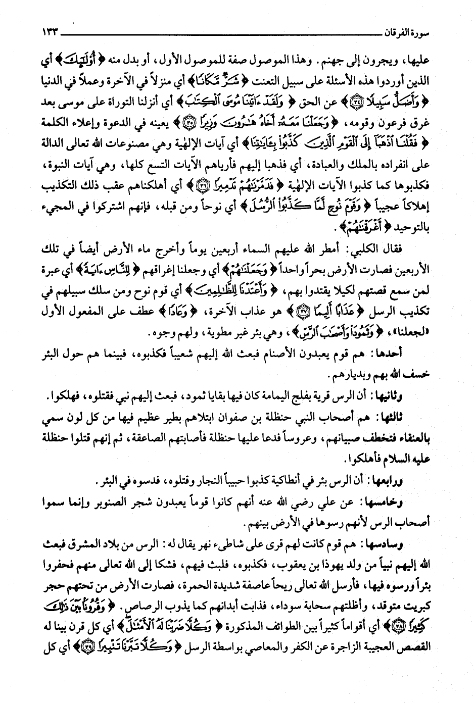 وسادسها: هم قوم كانت لهم قرى على شاطئ نهر يقال له: الرس من بلاد المشرق فبعث الله إليهم نبيا من ولد يهوذا بن يعقوب، فكذبوه، فلبث فيهم، فشكا إلى الله تعالى منهم فحفروا بئرا ورسوه فيها، فأرسل الله تعالى ريحا عاصفة شديدة الحمرة، فصارت الأرض من تحتهم حجر كبريت متوقد، وأظلتهم سحابة سوداء، فذابت أبدانهم كما يذوب الرصاص. وَقُرُوناً بَيْنَ ذلِكَ كَثِيراً (38) أي أقواما كثيرا بين الطوائف المذكورة وَكُلًّا ضَرَبْنا لَهُ الْأَمْثالَ أي كل قرن بينا له القصص العجيبة الزاجرة عن الكفر والمعاصي بواسطة الرسل وَكُلًّا تَبَّرْنا تَتْبِيراً (39) أي كل