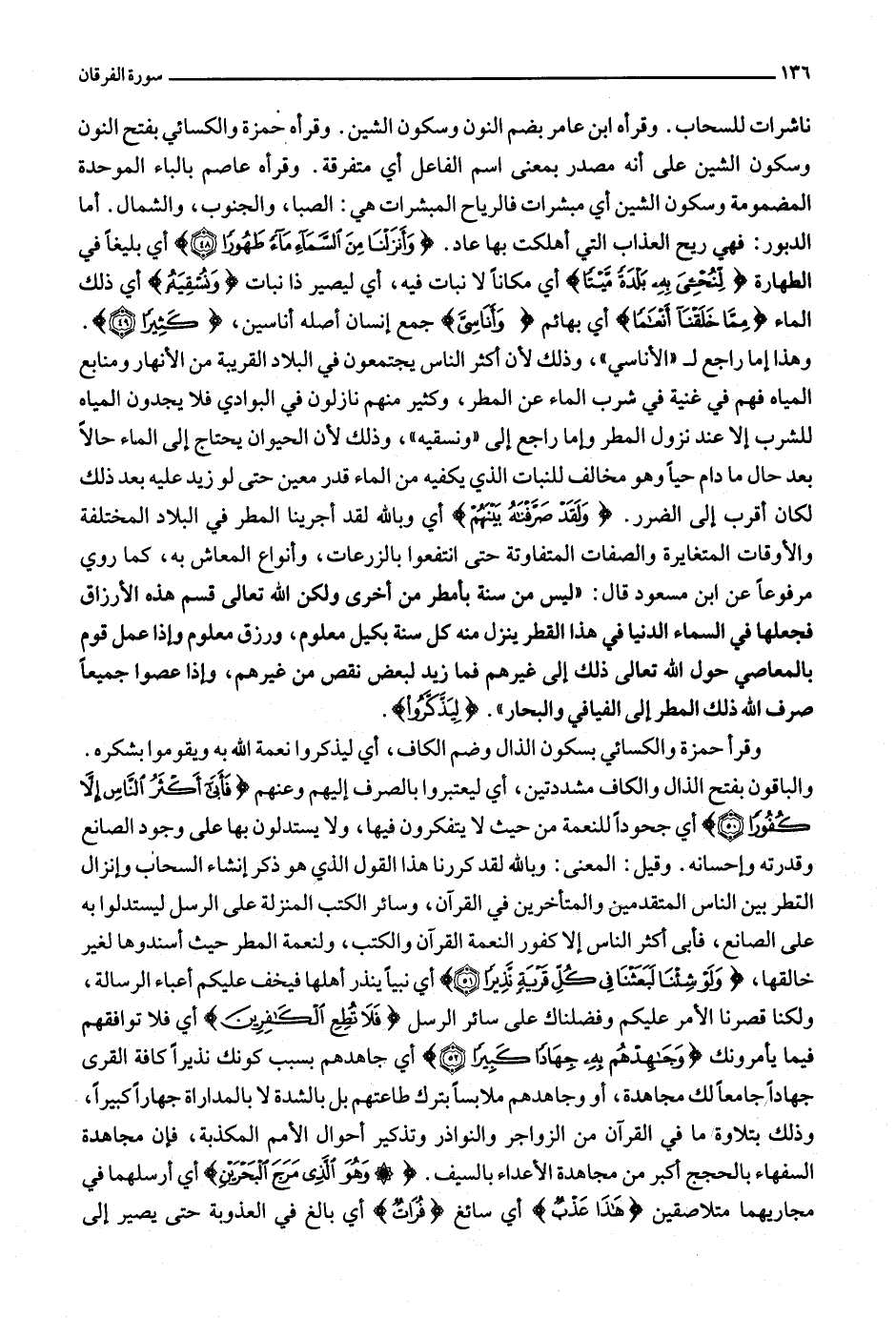 ناشرات للسحاب. وقرأه ابن عامر بضم النون وسكون الشين. وقرأه حمزة والكسائي بفتح النون وسكون الشين على أنه مصدر بمعنى اسم الفاعل أي متفرقة. وقرأه عاصم بالباء الموحدة المضمومة وسكون الشين أي مبشرات فالرياح المبشرات هي: الصبا، والجنوب، والشمال. أما الدبور: فهي ريح العذاب التي أهلكت بها عاد. وَأَنْزَلْنا مِنَ السَّماءِ ماءً طَهُوراً (48) أي بليغا في الطهارة لِنُحْيِيَ بِهِ بَلْدَةً مَيْتاً أي مكانا لا نبات فيه، أي ليصير ذا نبات وَنُسْقِيَهُ أي ذلك الماء مِمَّا خَلَقْنا أَنْعاماً أي بهائم وَأَناسِيَّ جمع إنسان أصله أناسين، كَثِيراً (49) .