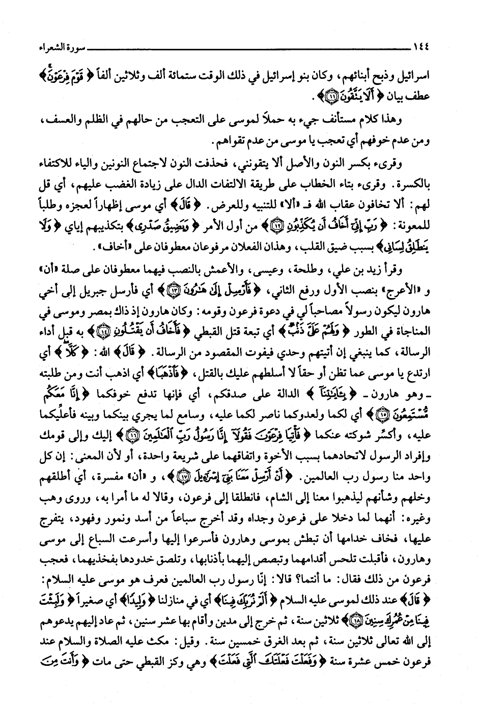وقرأ زيد بن علي، وطلحة، وعيسى، والأعمش بالنصب فيهما معطوفان على صلة «أن» و «الأعرج» بنصب الأول ورفع الثاني، فَأَرْسِلْ إِلى هارُونَ (13) أي فأرسل جبريل إلى أخي هارون ليكون رسولا مصاحبا لي في دعوة فرعون وقومه: وكان هارون إذ ذاك بمصر وموسى في المناجاة في الطور وَلَهُمْ عَلَيَّ ذَنْبٌ أي تبعة قتل القبطي فَأَخافُ أَنْ يَقْتُلُونِ (14) به قبل أداء الرسالة، كما ينبغي إن أتيتهم وحدي فيفوت المقصود من الرسالة. قالَ الله: كَلَّا أي ارتدع يا موسى عما تظن أو حقا لا أسلطهم عليك بالقتل، فَاذْهَبا أي اذهب أنت ومن طلبته- وهو هارون- بِآياتِنا الدالة على صدقكم، أي فإنها تدفع خوفكما إِنَّا مَعَكُمْ مُسْتَمِعُونَ (15) أي لكما ولعدوكما ناصر لكما عليه، وسامع لما يجري بينكما وبينه فأعلّيكما عليه، وأكسّر شوكته عنكماأْتِيا فِرْعَوْنَ فَقُولا إِنَّا رَسُولُ رَبِّ الْعالَمِينَ