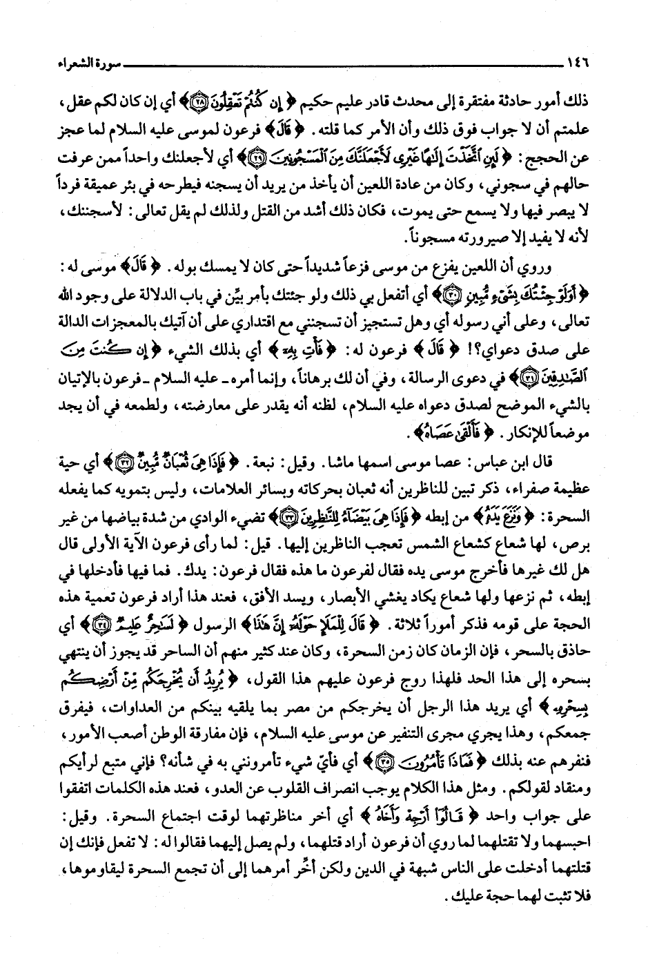 قال ابن عباس: عصا موسى اسمها ماشا. وقيل: نبعة. فَإِذا هِيَ ثُعْبانٌ مُبِينٌ (32) أي حية عظيمة صفراء، ذكر تبين للناظرين أنه ثعبان بحركاته وبسائر العلامات، وليس بتمويه كما يفعله السحرة: وَنَزَعَ يَدَهُ من إبطه فَإِذا هِيَ بَيْضاءُ لِلنَّاظِرِينَ (33) تضيء الوادي من شدة بيضاها من غير برص، لها شعاع كشعاع الشمس تعجب الناظرين إليها. قيل: لما رأى فرعون الآية الأولى قال هل لك غيرها فأخرج موسى يده فقال لفرعون ما هذه فقال فرعون: يدك. فما فيها فأدخلها في إبطه، ثم نزعها ولها شعاع يكاد يغشي الأبصار، ويسد الأفق، فعند هذا أراد فرعون تعمية هذه الحجة على قومه فذكر أمورا ثلاثة. قالَ لِلْمَلَإِ حَوْلَهُ إِنَّ هذا الرسول لَساحِرٌ عَلِيمٌ (34) أي حاذق بالسحر، فإن الزمان كان زمن السحرة، وكان عند كثير منهم أن الساحر قد يجوز أن ينتهي بسحره إلى هذا الحد فلهذا روج فرعون عليهم هذا القول، يُرِيدُ أَنْ يُخْرِجَكُمْ مِنْ أَرْضِكُمْ بِسِحْرِهِ أي يريد هذا الرجل أن يخرجكم من مصر بما يلقيه بينكم من العداوات، فيفرق جمعكم، وهذا يجري مجرى التنفير عن موسى عليه السلام، فإن مفارقة الوطن أصعب الأمور، فنفرهم عنه بذلك فَماذا تَأْمُرُونَ (35) أي فأيّ شيء تأمرونني به في شأنه؟ فإني متبع لرأيكم ومنقاد لقولكم. ومثل هذا الكلام يوجب انصراف القلوب عن العدو، فعند هذه الكلمات اتفقوا على جواب واحد قالُوا أَرْجِهْ وَأَخاهُ أي أخر مناظرتهما لوقت اجتماع السحرة. وقيل: