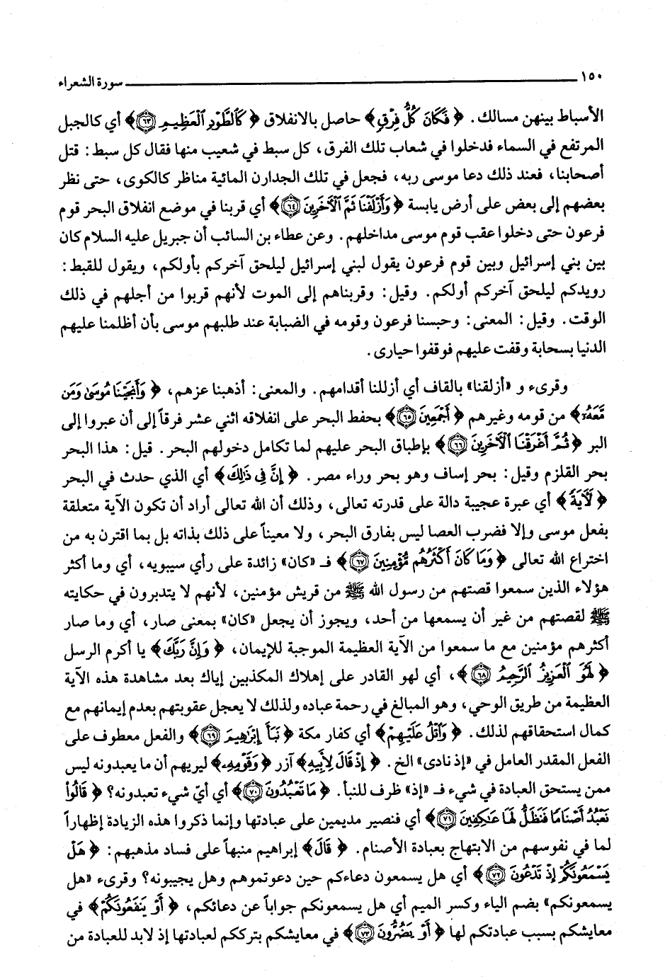 وقرئ و «أزلقنا» بالقاف أي أزللنا أقدامهم. والمعنى: أذهبنا عزهم، وَأَنْجَيْنا مُوسى وَمَنْ مَعَهُ من قومه وغيرهم أَجْمَعِينَ (65) بحفظ البحر على انفلاقه اثني عشر فرقا إلى أن عبروا إلى البر ثُمَّ أَغْرَقْنَا الْآخَرِينَ (66) بإطباق البحر عليهم لما تكامل دخولهم البحر. قيل: هذا البحر بحر القلزم وقيل: بحر إساف وهو بحر وراء مصر. إِنَّ فِي ذلِكَ أي الذي حدث في البحر لَآيَةً أي عبرة عجيبة دالة على قدرته تعالى، وذلك أن الله تعالى أراد أن تكون الآية متعلقة بفعل موسى وإلا فضرب العصا ليس بفارق البحر، ولا معينا على ذلك بذاته بل بما اقترن به من اختراع الله تعالى وَما كانَ أَكْثَرُهُمْ مُؤْمِنِينَ (67) ف «كان» زائدة على رأي سيبويه، أي وما أكثر هؤلاء الذين سمعوا قصتهم من رسول الله صلّى الله عليه وسلّم من قريش مؤمنين، لأنهم لا يتدبرون في حكايته صلّى الله عليه وسلّم لقصتهم من غير أن يسمعها من أحد، ويجوز أن يجعل «كان» بمعنى صار، أي وما صار أكثرهم مؤمنين مع ما سمعوا من الآية العظيمة الموجبة للإيمان، وَإِنَّ رَبَّكَ يا أكرم الرسل لَهُوَ الْعَزِيزُ الرَّحِيمُ (68) ، أي لهو القادر على إهلاك المكذبين إياك بعد مشاهدة هذه الآية العظيمة من طريق الوحي، وهو المبالغ في رحمة عباده ولذلك لا يعجل عقوبتهم بعدم إيمانهم مع كمال استحقاقهم لذلك. وَاتْلُ عَلَيْهِمْ أي كفار مكة نَبَأَ إِبْراهِيمَ (69) والفعل معطوف على الفعل المقدر العامل في «إذ نادى» إلخ. إِذْ قالَ لِأَبِيهِ آزر وَقَوْمِهِ ليريهم أن ما يعبدونه ليس ممن يستحق العبادة في شيء ف «إذ» ظرف للنبأ. ما تَعْبُدُونَ (70) أي أيّ شيء تعبدونه؟