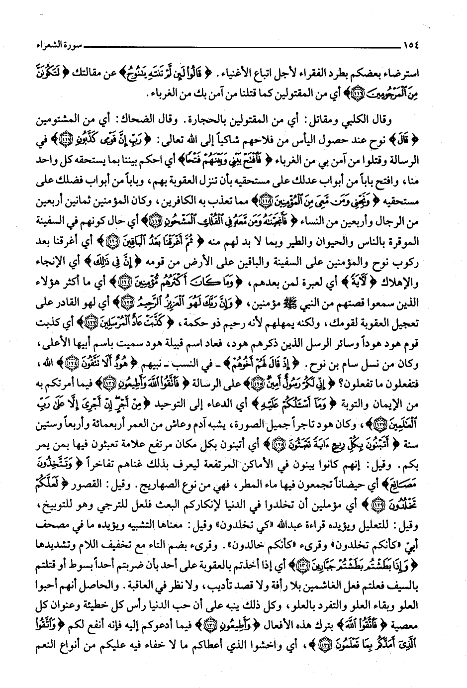 إِنَّ فِي ذلِكَ أي الإنجاء والإهلاك لَآيَةً أي لعبرة لمن بعدهم، وَما كانَ أَكْثَرُهُمْ مُؤْمِنِينَ (121) أي ما أكثر هؤلاء الذين سمعوا قصتهم من النبي صلّى الله عليه وسلّم مؤمنين، وَإِنَّ رَبَّكَ لَهُوَ الْعَزِيزُ الرَّحِيمُ (122) أي لهو القادر على تعجيل العقوبة لقومك، ولكنه يمهلهم لأنه رحيم ذو حكمة، كَذَّبَتْ عادٌ الْمُرْسَلِينَ (123) أي كذبت قوم هود هودا وسائر الرسل الذين ذكرهم هود، فعاد اسم قبيلة هود سميت باسم أبيها الأعلى، وكان من نسل سام بن نوح. إِذْ قالَ لَهُمْ أَخُوهُمْ- في النسب- نبيهم هُودٌ أَلا تَتَّقُونَ (124) الله، فتفعلون ما تفعلون؟ إِنِّي لَكُمْ رَسُولٌ أَمِينٌ (125) على الرسالة فَاتَّقُوا اللَّهَ وَأَطِيعُونِ (126) فيما أمرتكم به من الإيمان والتوبة وَما أَسْئَلُكُمْ عَلَيْهِ أي الدعاء إلى التوحيد مِنْ أَجْرٍ إِنْ أَجْرِيَ إِلَّا عَلى رَبِّ الْعالَمِينَ (127) ، وكان هود تاجرا جميل الصورة، يشبه آدم وعاش من العمر أربعمائة وأربعا وستين سنة أَتَبْنُونَ بِكُلِّ رِيعٍ آيَةً تَعْبَثُونَ (128) أي أتبنون بكل مكان مرتفع علامة تعبثون فيها بمن يمر بكم. وقيل: إنهم كانوا يبنون في الأماكن المرتفعة ليعرف بذلك غناهم تفاخرا وَتَتَّخِذُونَ مَصانِعَ أي حيضانا تجمعون فيها ماء المطر، فهي من نوع الصهاريج. وقيل: القصور لَعَلَّكُمْ تَخْلُدُونَ (129) أي مؤملين أن تخلدوا في الدنيا لإنكاركم البعث فلعل للتجري وهو للتوبيخ، وقيل: للتعليل ويؤيده قراءة عبد الله «كي تخلدون» وقيل: معناها التشبيه ويؤيده ما في مصحف أبيّ «كأنكم تخلدون» وقرئ «كأنكم خالدون» . وقرئ بضم التاء مع تخفيف اللام وتشديدها وَإِذا بَطَشْتُمْ بَطَشْتُمْ جَبَّارِينَ (130) أي إذا أخذتم بالعقوبة على أحد بأن ضربتم أحدا بسوط أو قتلتم بالسيف فعلتم فعل الغاشمين بلا رأفة ولا قصد تأديب، ولا نظر في العاقبة. والحاصل أنهم أحبوا العلو وبقاء العلو والتفرد بالعلو، وكل ذلك ينبه على أن حب الدنيا رأس كل خطيئة وعنوان كل معصية
