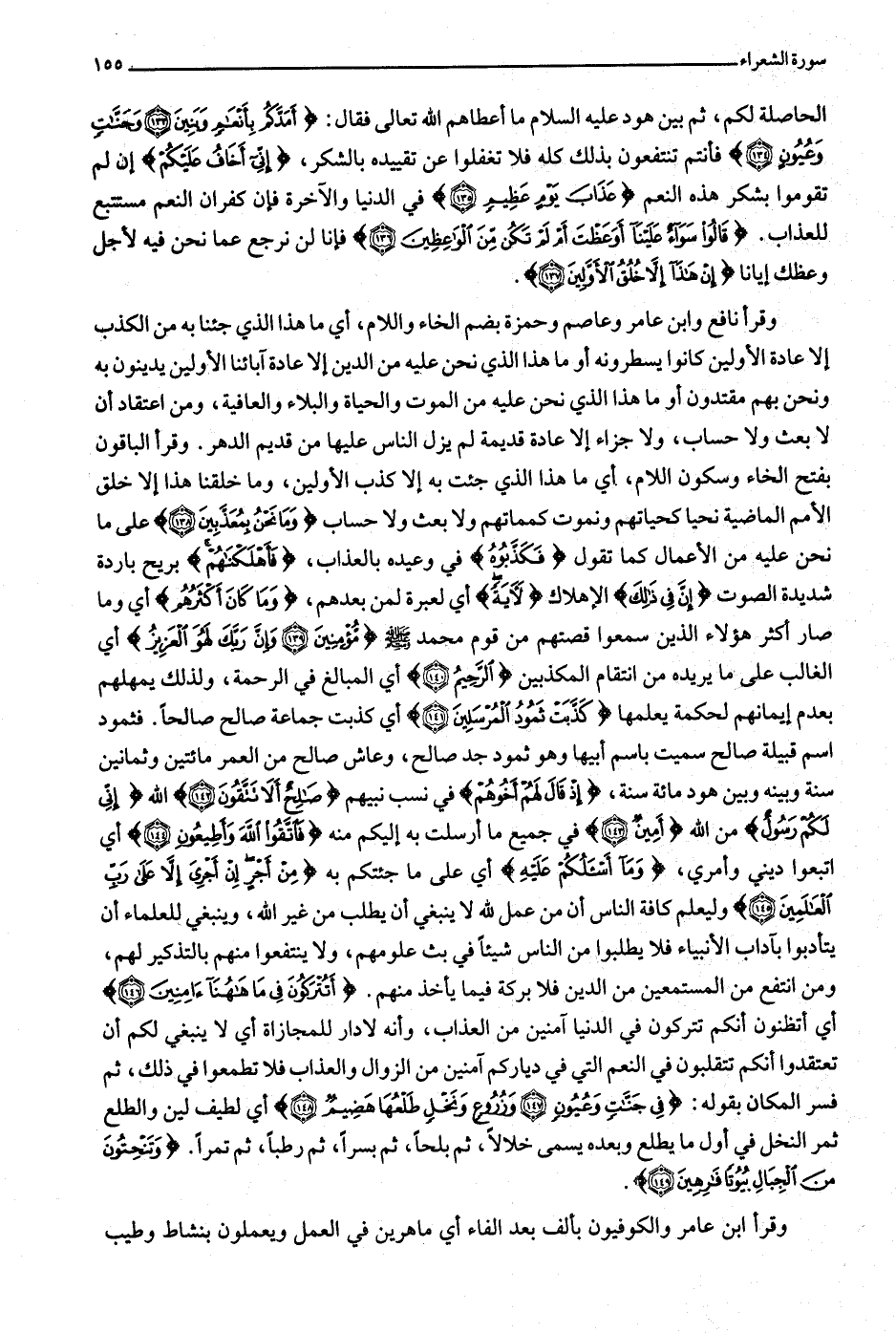 كَذَّبَتْ ثَمُودُ الْمُرْسَلِينَ (141) أي كذبت جماعة صالح صالحا. فثمود اسم قبيلة صالح سميت باسم أبيها وهو ثمود جد صالح، وعاش صالح من العمر مائتين وثمانين سنة وبينه وبين هود مائة سنة، إِذْ قالَ لَهُمْ أَخُوهُمْ في نسب نبيهم صالِحٌ أَلا تَتَّقُونَ (142) الله إِنِّي لَكُمْ رَسُولٌ من الله أَمِينٌ (143) في جميع ما أرسلت به إليكم منه فَاتَّقُوا اللَّهَ وَأَطِيعُونِ (144) أي اتبعوا ديني وأمري، وَما أَسْئَلُكُمْ عَلَيْهِ أي على ما جئتكم به مِنْ أَجْرٍ إِنْ أَجْرِيَ إِلَّا عَلى رَبِّ الْعالَمِينَ (145) وليعلم كافة الناس أن من عمل لله لا ينبغي أن يطلب من غير الله، وينبغي للعلماء أن يتأدبوا بآداب الأنبياء فلا يطلبوا من الناس شيئا في بث علومهم، ولا ينتفعوا منهم بالتذكير لهم، ومن انتفع من المستمعين من الدين فلا بركة فيما يأخذ منهم. أَتُتْرَكُونَ فِي ما هاهُنا آمِنِينَ (146) أي أتظنون أنكم تتركون في الدنيا آمنين من العذاب، وأنه لا دار للمجازاة أي لا ينبغي لكم أن تعتقدوا أنكم تتقلبون في النعم التي في دياركم آمنين من الزوال والعذاب فلا تطمعوا في ذلك، ثم فسر المكان بقوله: فِي جَنَّاتٍ وَعُيُونٍ (147) وَزُرُوعٍ وَنَخْلٍ طَلْعُها هَضِيمٌ