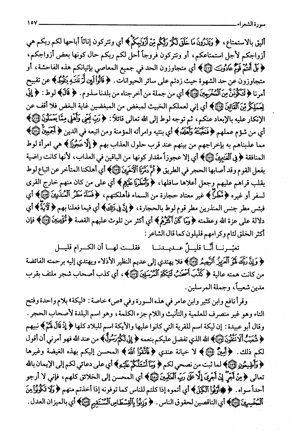إِلَّا عَجُوزاً هي امرأة لوط المنافقة فِي الْغابِرِينَ (171) أي إلا عجوزا مقدار كونها من الباقين في العذاب، لأنها كانت راضية بفعل القوم وقد أصابها الحجر في الطريق ثُمَّ دَمَّرْنَا الْآخَرِينَ (172) أي أهلكنا المتأخر عن اتباع لوط بقلب قراهم عليهم وجعل أعلاها سافلها، وَأَمْطَرْنا عَلَيْهِمْ أي على من كان منهم خارج القرى لسفر أو غيره مَطَراً غير معتاد حجارة من السماء فأهلكتهم، فَساءَ مَطَرُ الْمُنْذَرِينَ (173) أي فبئس مطر جنس المنذرين مطر قوم لوط بالحجارة، إِنَّ فِي ذلِكَ أي فيما فعلنا بهم لَآيَةً أي دلالة على عزة الله وعظمته وَما كانَ أَكْثَرُهُمْ أي أكثر من تلوث عليهم القصة مُؤْمِنِينَ (174) فإن أكثر الخلق لئام وكرامهم قليلون كما قال الشاعر: