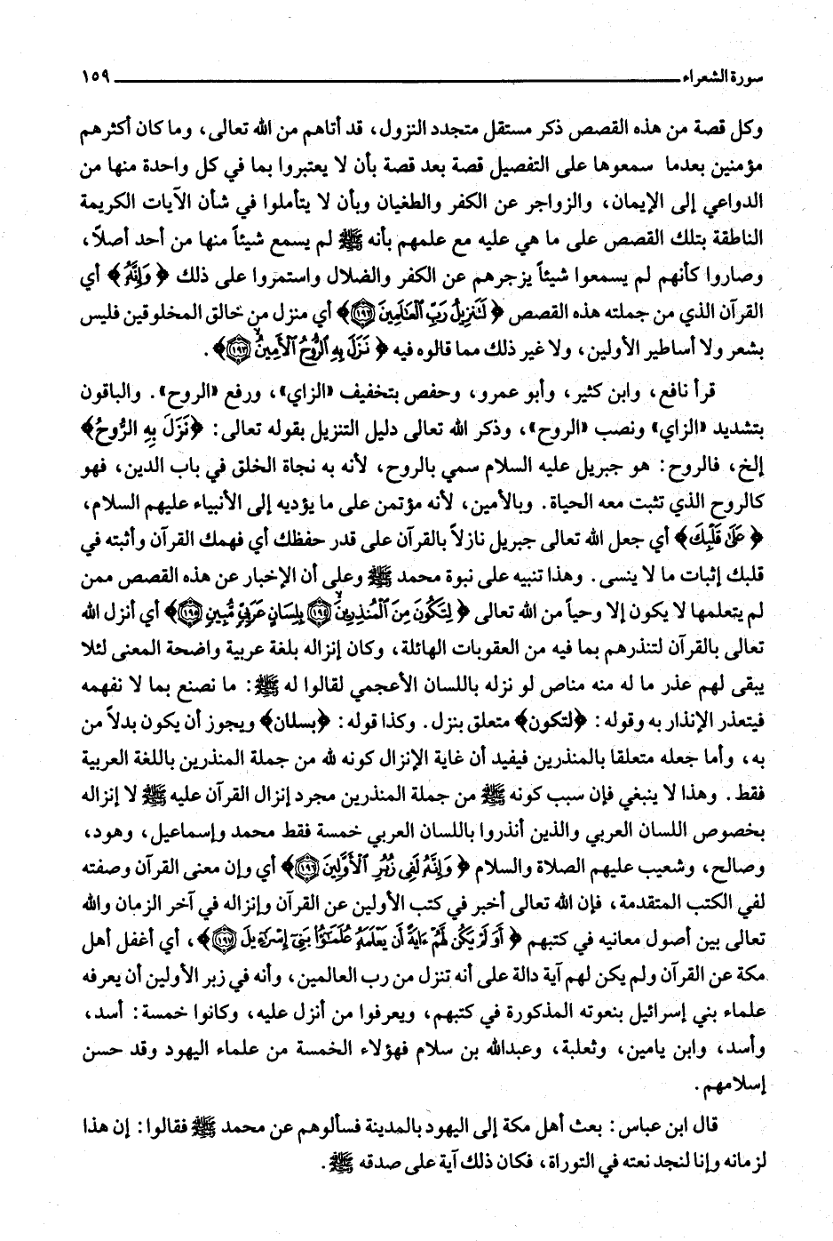 قرأ نافع، وابن كثير، وأبو عمرو، وحفص بتخفيف «الزاي» ، ورفع «الروح» . والباقون بتشديد «الزاي» ونصب «الروح» ، وذكر الله تعالى دليل التنزيل بقوله تعالى: نَزَلَ بِهِ الرُّوحُ إلخ، فالروح: هو جبريل عليه السلام سمي بالروح، لأنه به نجاة الخلق في باب الدين، فهو كالروح الذي تثبت معه الحياة. وبالأمين، لأنه مؤتمن على ما يؤديه إلى الأنبياء عليهم السلام، عَلى قَلْبِكَ أي جعل الله تعالى جبريل نازلا بالقرآن على قدر حفظك أي فهمك القرآن وأثبته في قلبك إثبات ما لا ينسى. وهذا تنبيه على نبوة محمد صلّى الله عليه وسلّم وعلى أن الإخبار عن هذه القصص ممن لم يتعلمها لا يكون إلا وحيا من الله تعالى لِتَكُونَ مِنَ الْمُنْذِرِينَ (194) بِلِسانٍ عَرَبِيٍّ مُبِينٍ (195) أي أنزل الله تعالى بالقرآن لتنذرهم بما فيه من العقوبات الهائلة، وكان إنزاله بلغة عربية واضحة المعنى لئلا يبقى لهم عذر ما له منه مناص لو نزله باللسان الأعجمي لقالوا له صلّى الله عليه وسلّم: ما نصنع بما لا نفهمه فيتعذر الإنذار به وقوله: لِتَكُونَ متعلق بنزل. وكذا قوله: بِلِسانٍ ويجوز أن يكون بدلا من به، وأما جعله متعلقا بالمنذرين فيفيد أن غاية الإنزال كونه لله من جملة المنذرين باللغة العربية فقط. وهذا لا ينبغي فإن سبب كونه صلّى الله عليه وسلّم من جملة المنذرين مجرد إنزال القرآن عليه صلّى الله عليه وسلّم لا إنزاله بخصوص اللسان العربي والذين أنذروا باللسان العربي خمسة فقط محمد وإسماعيل، وهود، وصالح، وشعيب عليهم الصلاة والسلام وَإِنَّهُ لَفِي زُبُرِ الْأَوَّلِينَ (196) أي وإن معنى القرآن وصفته لفي الكتب المتقدمة، فإن الله تعالى أخبر في كتب الأولين عن القرآن وإنزاله في آخر الزمان والله تعالى بين أصول معانيه في كتبهم أَوَلَمْ يَكُنْ لَهُمْ آيَةً أَنْ يَعْلَمَهُ عُلَماءُ بَنِي إِسْرائِيلَ (197) ، أي أغفل أهل مكة عن القرآن ولم يكن لهم آية دالة على أنه تنزل من رب العالمين، وأنه في زبر الأولين أن يعرفه علماء بني إسرائيل بنعوته المذكورة في كتبهم، ويعرفوا من أنزل عليه، وكانوا خمسة: أسد، وأسد، وابن يامين، وثعلبة، وعبد الله بن سلام فهؤلاء الخمسة من علماء اليهود وقد حسن إسلامهم.