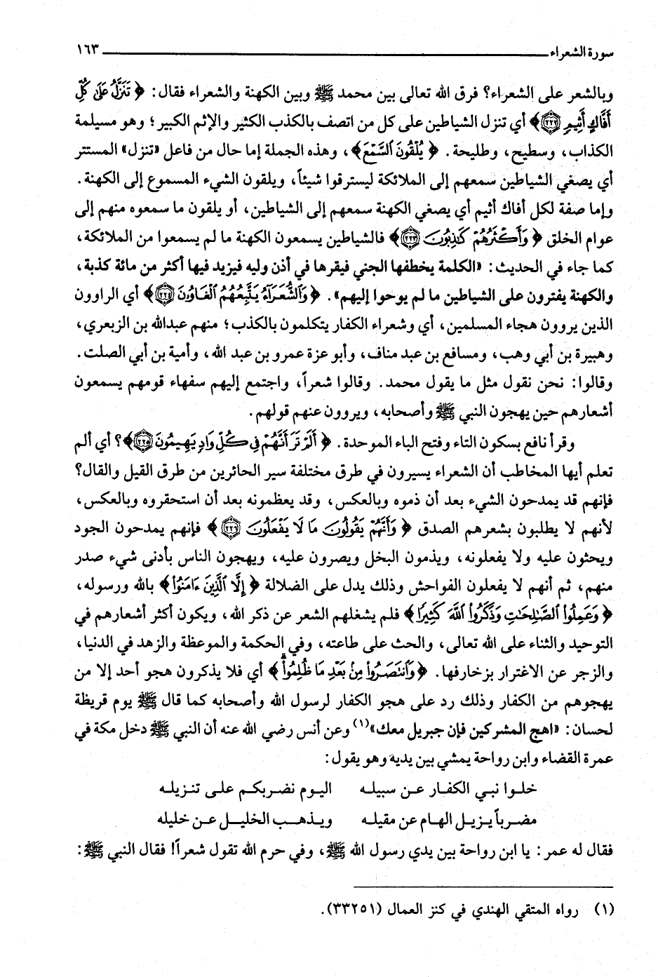 . وَالشُّعَراءُ يَتَّبِعُهُمُ الْغاوُونَ (224) أي الراوون الذين يروون هجاء المسلمين، أي وشعراء الكفار يتكلمون بالكذب منهم عبد الله بن الزبعري، وهبيرة بن أبي وهب، ومسافع بن عبد مناف، وأبو عزة عمرو بن عبد الله، وأمية بن أبي الصلت.