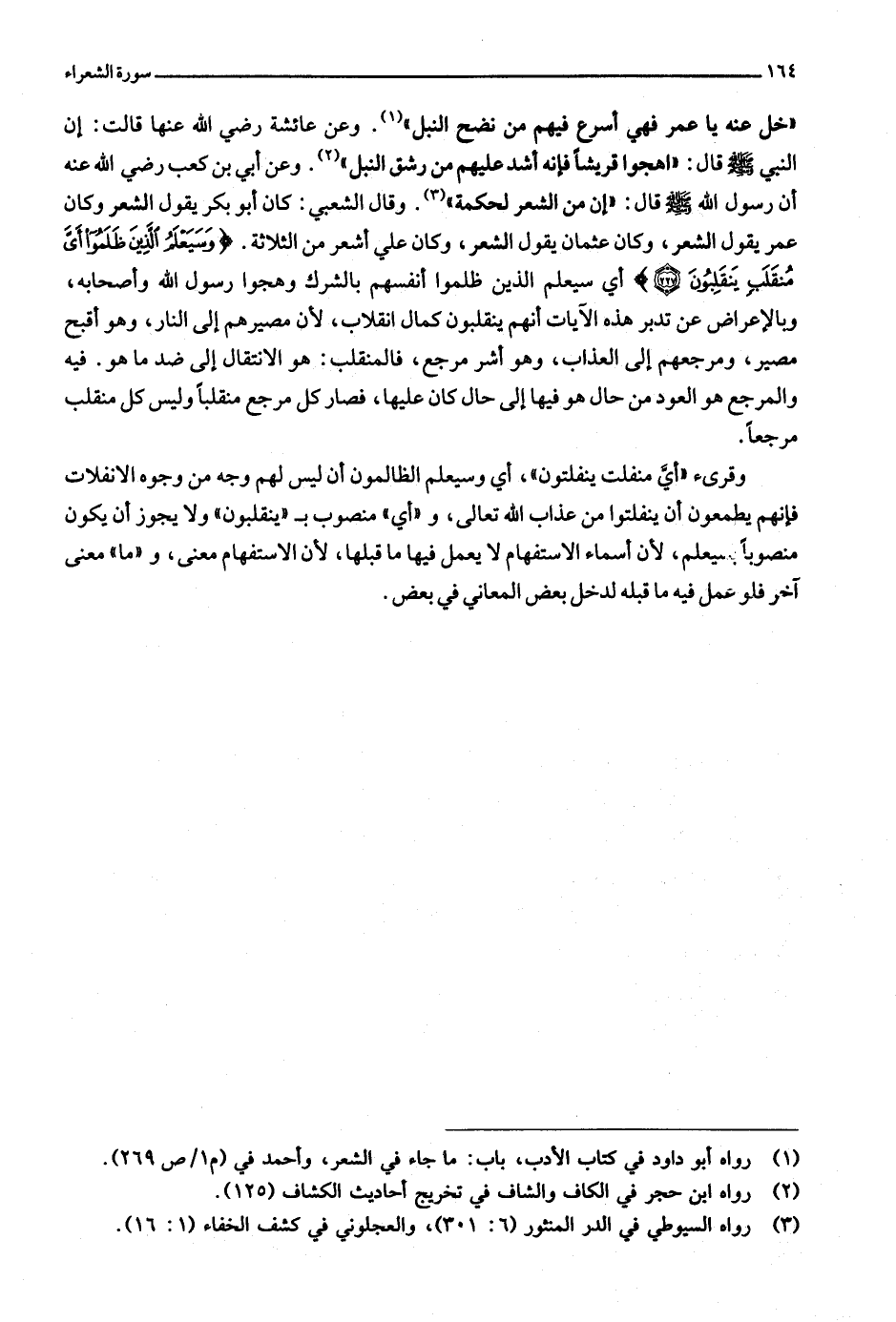 «3» . وقال الشعبي: كان أبو بكر يقول الشعر وكان عمر يقول الشعر، وكان عثمان يقول الشعر، وكان علي أشعر من الثلاثة. وَسَيَعْلَمُ الَّذِينَ ظَلَمُوا أَيَّ مُنْقَلَبٍ يَنْقَلِبُونَ (227) أي سيعلم الذين ظلموا أنفسهم بالشرك وهجوا رسول الله وأصحابه، وبالإعراض عن تدبر هذه الآيات أنهم ينقلبون كمال انقلاب، لأن مصيرهم إلى النار، وهو أقبح مصير، ومرجعهم إلى العذاب، وهو أشر مرجع، فالمنقلب: هو الانتقال إلى ضد ما هو. فيه والمرجع هو العود من حال هو فيها إلى حال كان عليها، فصار كل مرجع منقلبا وليس كل منقلب مرجعا.