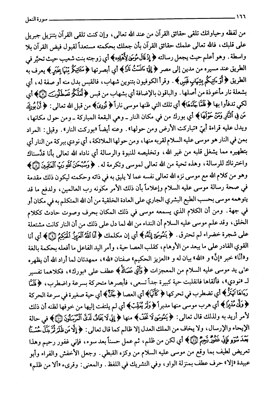 من لفظه وحيا وإنك تلقى حقائق القرآن من عند الله تعالى، وإن كنت تلقى القرآن بتنزيل جبريل على قلبك، فالله تعالى علمك حقائق القرآن بأن جعلك بحكمته مستعدا لقبول فيض القرآن بلا واسطة. وهو أعلم حيث يجعل رسالته إِذْ قالَ مُوسى لِأَهْلِهِ أي زوجته بنت شعيب حيث تحيّر في الطريق عند مسيره من مدين إلى مصر إِنِّي آنَسْتُ ناراً أي أبصرتها سَآتِيكُمْ مِنْها بِخَبَرٍ يعرف به الطريق أَوْ آتِيكُمْ بِشِهابٍ قَبَسٍ. وقرأ الكوفيون بتنوين شهاب، فالقبس بدل منه أو صفة له، أي بشعلة نار مأخوذة من أصلها. والباقون بالإضافة أي بشهاب من قبس لَعَلَّكُمْ تَصْطَلُونَ (7) أي لكي تدفئوا بها فَلَمَّا جاءَها أي تلك التي ظنها موسى نارا نُودِيَ من قبل الله تعالى: أَنْ بُورِكَ مَنْ فِي النَّارِ وَمَنْ حَوْلَها أي بورك من في مكان النار- وهي البقعة المباركة- ومن حول مكانها، ويدل عليه قراءة أبيّ «تباركت الأرض ومن حولها» . وعنه أيضا «بوركت النار» . وقيل: المراد بمن في النار هو موسى عليه السلام لقربه منها، ومن حولها الملائكة، أي نودي ببركة من النار أي بتطهيره مما يشغل قلبه من غير الله، وتخليصه للنبوة والرسالة أي ناداه الله تعالى بأنا قدّسناك واخترناك للرسالة، وهذه تحية من الله تعالى لموسى وتكرمة له. وَسُبْحانَ اللَّهِ رَبِّ الْعالَمِينَ (8) وهو من كلام الله مع موسى نزه الله تعالى نفسه عما لا يليق به في ذاته وحكمته ليكون ذلك مقدمة في صحة رسالة موسى عليه السلام وإعلاما بأن ذلك الأمر مكونه رب العالمين، ولدفع ما قد يتوهمه موسى بحسب الطبع البشري الجاري على العادة الخلقية من أن الله المتكلم به في مكان أو في جهة. ومن أن الكلام الذي يسمعه موسى في ذلك المكان بحرف وصوت حادث ككلام الخلق، وقد علم موسى عليه السلام أن النداء من الله لما دل على ذلك من أن النار كانت مشتعلة على شجرة خضراء لم تحترق. يا مُوسى إِنَّهُ أي إن مكلمك أَنَا اللَّهُ الْعَزِيزُ الْحَكِيمُ (9) أي أنا القوي القادر على ما يبعد من الأوهام، كقلب العصا حية، وأمر اليد الفاعل ما أفعله بحكمة بالغة و «أنّا» خبر «إنّ» و «الله» بيان له و «العزيز الحكيم» صفتان «لله» ، ممهدتان لما أراد الله أن يظهره على يد موسى عليه السلام من المعجزات وَأَلْقِ عَصاكَ عطف على «بورك» ، فكلاهما تفسير ل «نودي» ، فألقاها فانقلبت حية كبيرة جدا تسعى، فأبصرها متحركة بسرعة واضطرب، فَلَمَّا رَآها تَهْتَزُّ أي تضطرب في تحركها كَأَنَّها أي العصا جَانٌّ أي حية صغيرة في سرعة الحركة وَلَّى مُدْبِراً أي هرب موسى منها مدبرا وَلَمْ يُعَقِّبْ أي لم يلتفت إليها من خوفها لظنه أن ذلك لأمر أريد به ولذلك قال تعالى: يا مُوسى لا تَخَفْ منها إِنِّي لا يَخافُ لَدَيَّ الْمُرْسَلُونَ (10) في حالة الإيحاء والإرسال،