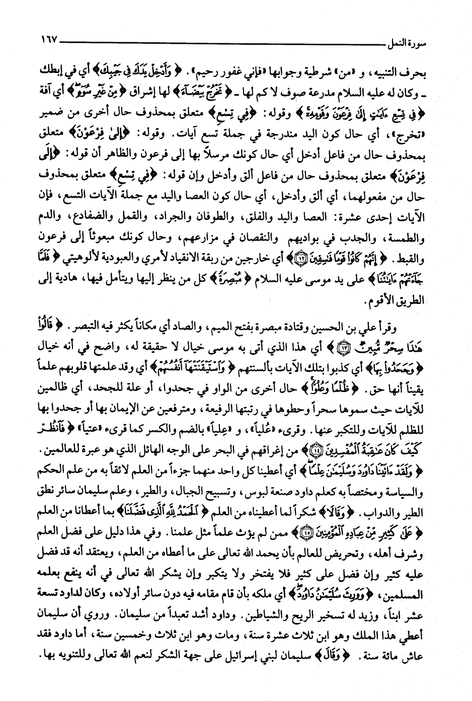 وَلَقَدْ آتَيْنا داوُدَ وَسُلَيْمانَ عِلْماً أي أعطينا كل واحد منهما جزءا من العلم لائقا به من علم الحكم والسياسة ومختصا به كعلم داود صنعة لبوس، وتسبيح الجبال، والطير، وعلم سليمان سائر نطق الطير والدواب. وَقالا شكرا لما أعطيناه من العلم الْحَمْدُ لِلَّهِ الَّذِي فَضَّلَنا بما أعطانا من العلم عَلى كَثِيرٍ مِنْ عِبادِهِ الْمُؤْمِنِينَ (15) ممن لم يؤت علما مثل علمنا. وفي هذا دليل على فضل العلم وشرف أهله، وتحريض للعالم بأن يحمد الله تعالى على ما أعطاه من العلم، ويعتقد أنه قد فضل عليه كثير وإن فضل على كثير فلا يفتخر ولا يتكبر وإن يشكر الله تعالى في أنه ينفع بعلمه المسلمين، وَوَرِثَ سُلَيْمانُ داوُدَ أي ملكه بأن قام مقامه فيه دون سائر أولاده، وكان لداود تسعة عشر ابنا، وزيد له تسخير الريح والشياطين. وداود أشد تعبدا من سليمان. وروي أن سليمان أعطي هذا الملك وهو ابن ثلاث عشرة سنة، ومات وهو ابن ثلاث وخمسين سنة، أما داود فقد عاش مائة سنة. وَقالَ سليمان لبني إسرائيل على جهة الشكر لنعم الله تعالى وللتنويه بها.
