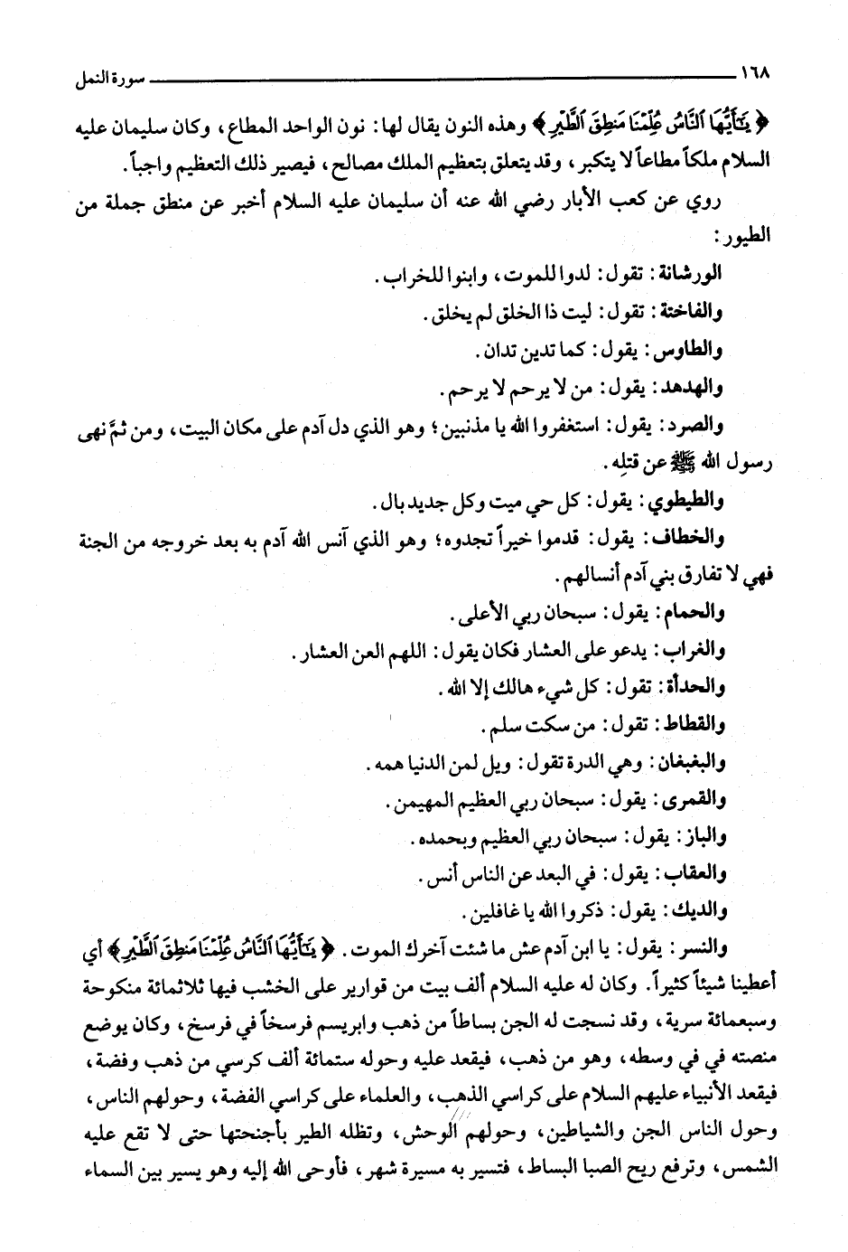 والنسر: يقول: يا ابن آدم عش ما شئت آخرك الموت. يا أَيُّهَا النَّاسُ عُلِّمْنا مَنْطِقَ الطَّيْرِ أي أعطينا شيئا كثيرا. وكان له عليه السلام ألف بيت من قوارير على الخشب فيها ثلاثمائة منكوحة وسبعمائة سرية، وقد نسجت له الجن بساطا من ذهب وإبريسم فرسخا في فرسخ، وكان يوضع منصته في في وسطه، وهو من ذهب، فيقعد عليه وحوله ستمائة ألف كرسي من ذهب وفضة، فيقعد الأنبياء عليهم السلام على كراسي الذهب، والعلماء على كراسي الفضة، وحولهم الناس، وحول الناس الجن والشياطين، وحولهم الوحش، وتظله الطير بأجنحتها حتى لا تقع عليه الشمس، وترفع ريح الصبا البساط، فتسير به مسيرة شهر، فأوحى الله إليه وهو يسير بين السماء