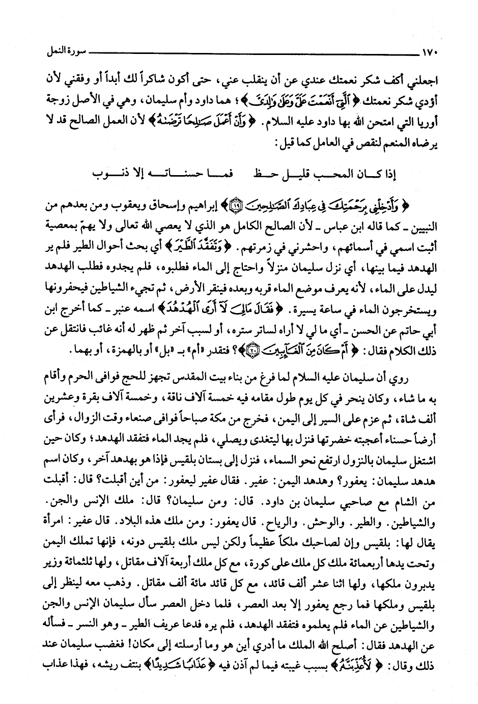 وَأَدْخِلْنِي بِرَحْمَتِكَ فِي عِبادِكَ الصَّالِحِينَ (19) إبراهيم وإسحاق ويعقوب ومن بعدهم من النبيين- كما قاله ابن عباس- لأن الصالح الكامل هو الذي لا يعصي الله تعالى ولا يهمّ بمعصية أثبت اسمي في أسمائهم، واحشرني في زمرتهم. وَتَفَقَّدَ الطَّيْرَ أي بحث أحوال الطير فلم ير الهدهد فيما بينها، أي نزل سليمان منزلا واحتاج إلى الماء فطلبوه، فلم يجدوه فطلب الهدهد ليدل على الماء، لأنه يعرف موضع الماء قربه وبعده فينقر الأرض، ثم تجيء الشياطين فيحفرونها ويستخرجون الماء في ساعة يسيرة. فَقالَ ما لِيَ لا أَرَى الْهُدْهُدَ اسمه عنبر- كما أخرج ابن أبي حاتم عن الحسن- أي ما لي لا أراه لساتر ستره، أو لسبب آخر ثم ظهر له أنه غائب فانتقل عن ذلك الكلام فقال: أَمْ كانَ مِنَ الْغائِبِينَ (20) ؟ فتقدر «أم» ب «بل» أو بالهمزة، أو بهما.