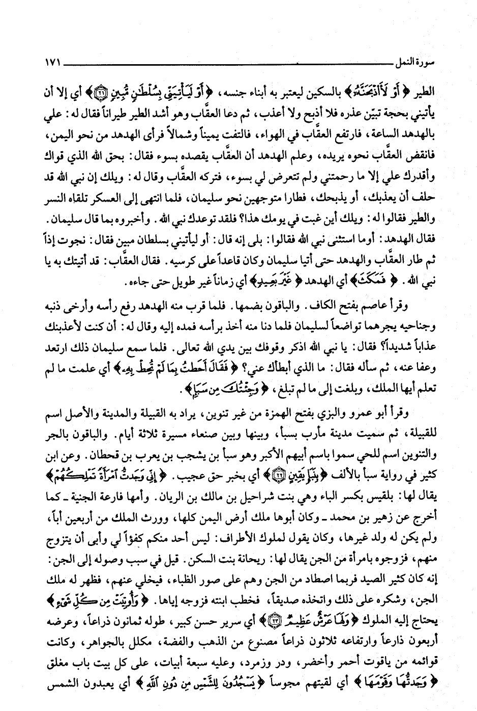 الطير أَوْ لَأَذْبَحَنَّهُ بالسكين ليعتبر به أبناء جنسه، أَوْ لَيَأْتِيَنِّي بِسُلْطانٍ مُبِينٍ (21) أي إلا أن يأتيني بحجة تبيّن عذره فلا أذبح ولا أعذب، ثم دعا العقاب وهو أشد الطير طيرانا فقال له: علي بالهدهد الساعة، فارتفع العقاب في الهواء، فالتفت يمينا وشمالا فرأى الهدهد من نحو اليمن، فانقض العقاب نحوه يريده، وعلم الهدهد أن العقاب يقصده بسوء فقال: بحق الله الذي قواك وأقدرك علي إلا ما رحمتني ولم تتعرض لي بسوء، فتركه العقاب وقال له: ويلك إن نبي الله قد حلف أن يعذبك، أو يذبحك، فطارا متوجهين نحو سليمان، فلما انتهى إلى العسكر تلقاه النسر والطير فقالوا له: ويلك أين غبت في يومك هذا؟ فلقد توعدك نبي الله. وأخبروه بما قال سليمان.