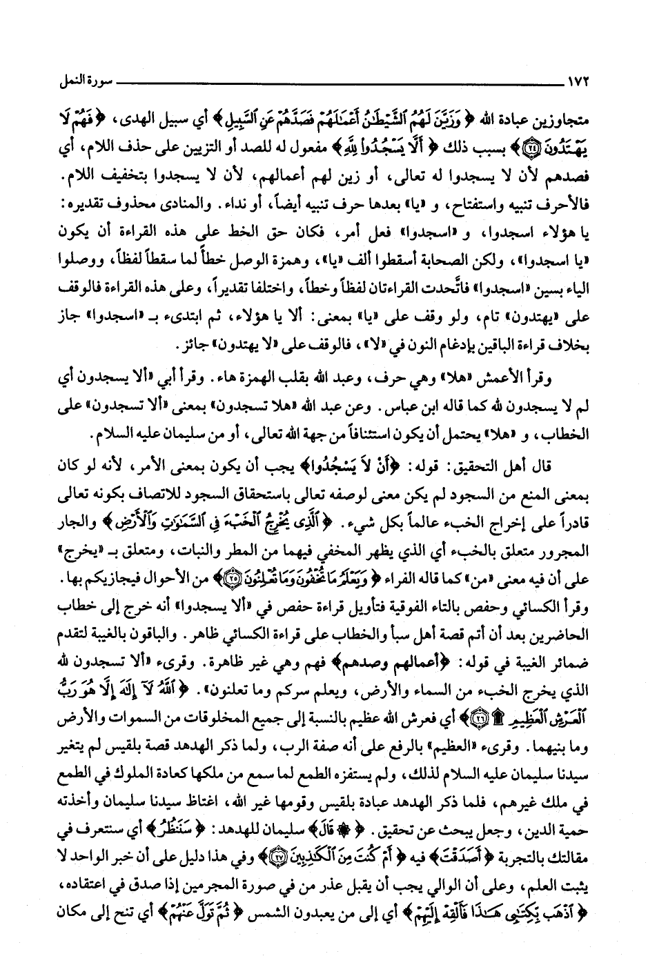 قال أهل التحقيق: قوله: أَلَّا يَسْجُدُوا يجب أن يكون بمعنى الأمر، لأنه لو كان بمعنى المنع من السجود لم يكن معنى لوصفه تعالى باستحقاق السجود للاتصاف بكونه تعالى قادرا على إخراج الخبء عالما بكل شيء. الَّذِي يُخْرِجُ الْخَبْءَ فِي السَّماواتِ وَالْأَرْضِ والجار المجرور متعلق بالخبء أي الذي يظهر المخفي فيهما من المطر والنبات، ومتعلق ب «يخرج» على أن فيه معنى «من» كما قاله الفراء وَيَعْلَمُ ما تُخْفُونَ وَما تُعْلِنُونَ (25) من الأحوال فيجازيكم بها.