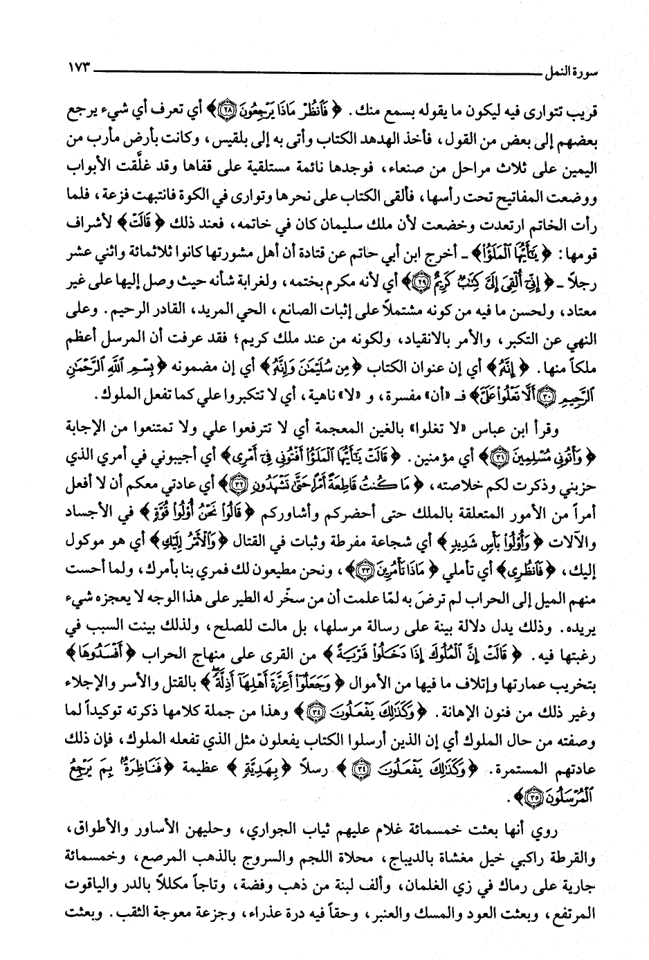 وقرأ ابن عباس «لا تغلوا» بالغين المعجمة أي لا تترفعوا علي ولا تمتنعوا من الإجابة وَأْتُونِي مُسْلِمِينَ (31) أي مؤمنين. قالَتْ يا أَيُّهَا الْمَلَأُ أَفْتُونِي فِي أَمْرِي أي أجيبوني في أمري الذي حزبني وذكرت لكم خلاصته، ما كُنْتُ قاطِعَةً أَمْراً حَتَّى تَشْهَدُونِ (32) أي عادتي معكم أن لا أفعل أمرا من الأمور المتعلقة بالملك حتى أحضركم وأشاوركم قالُوا نَحْنُ أُولُوا قُوَّةٍ في الأجساد والآلات وَأُولُوا بَأْسٍ شَدِيدٍ أي شجاعة مفرطة وثبات في القتال وَالْأَمْرُ إِلَيْكِ أي هو موكول إليك، فَانْظُرِي أي تأملي ماذا تَأْمُرِينَ (33) ، ونحن مطيعون لك فمري بنا بأمرك، ولما أحست منهم الميل إلى الحراب لم ترض به لمّا علمت أن من سخّر له الطير على هذا الوجه لا يعجزه شيء يريده. وذلك يدل دلالة بينة على رسالة مرسلها، بل مالت للصلح، ولذلك بينت السبب في رغبتها فيه. قالَتْ إِنَّ الْمُلُوكَ إِذا دَخَلُوا قَرْيَةً من القرى على منهاج الحراب أَفْسَدُوها بتخريب عمارتها وإتلاف ما فيها من الأموال وَجَعَلُوا أَعِزَّةَ أَهْلِها أَذِلَّةً بالقتل والأسر والإجلاء وغير ذلك من فنون الإهانة. وَكَذلِكَ يَفْعَلُونَ (34) وهذا من جملة كلامها ذكرته توكيدا لما وصفته من حال الملوك أي إن الذين أرسلوا الكتاب يفعلون مثل الذي تفعله الملوك، فإن ذلك عادتهم المستمرة. إِنِّي مُرْسِلَةٌ رسلا بِهَدِيَّةٍ عظيمة فَناظِرَةٌ بِمَ يَرْجِعُ الْمُرْسَلُونَ (35) .