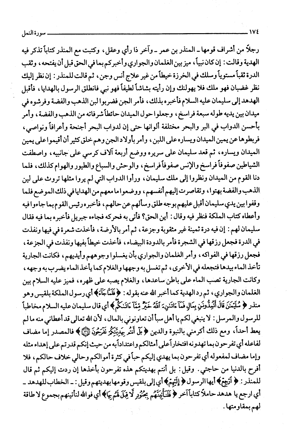 رجلا من أشراف قومها- المنذر بن عمر- وآخر ذا رأي وعقل، وكتبت مع المنذر كتابا تذكر فيه الهدية وقالت: إن كان نبيا، ميز بين الغلمان والجواري وأخبركم بما في الحق قبل أن يفتحه، وثقب الدرة ثقبا مستويا وسلك في الخرزة خيطا من غير علاج أنس وجن، ثم قالت للمنذر: إن نظر إليك نظر غضبان فهو ملك فلا يهولنك وإن رأيته بشاشا لطيفا فهو نبي فانطلق الرسول بالهدايا، فأقبل الهدهد إلى سليمان عليه السلام فأخبره بذلك، فأمر الجن فضربوا لبن الذهب والفضة وفرشوه في ميدان بين يديه طوله سبعة فراسخ، وجعلوا حول الميدان حائطا شرفاته من الذهب والفضة، وأمر بأحسن الدواب في البر والبحر مختلفة ألوانها حتى إن لدواب البحر أجنحة وأعرافا ونواصي، فربطوها عن يمين الميدان ويساره على اللبن، وأمر بأولاد الجن وهم خلق كثير أن أقيموا على يمين الميدان ويساره، ثم قعد سليمان على سريره ووضع أربعة آلاف كرسي على جانبيه، واصطفت الشياطين صفوفا فراسخ والإنس صفوفا فراسخ، والوحش والسباع والطيور والهوام كذلك، فلما دنا القوم من الميدان ونظروا إلى ملك سليمان، ورأوا الدواب التي لم يروا مثلها تروث على لين الذهب والفضة بهتوا، وتقاصرت إليهم أنفسهم، ووضعوا ما معهم من الهدايا في ذلك الموضع فلما وقفوا بين يدي سليمان أقبل عليهم بوجه طلق وسألهم عن حالهم، فأخبره رئيس القوم بما جاءوا فيه وأعطاه كتاب الملكة فنظر فيه وقال: أين الحق؟ فأتى به فحركه فجاءه جبريل فأخبره بما فيه فقال سليمان لهم: إن فيه درة ثمينة غير مثقوبة وجزعة، ثم أمر بالأرضة، فأخذت شعرة في فيها ونفذت في الدرة فجعل رزقها في الشجرة فأمر بالدودة البيضاء، فأخذت خيطا بفيها ونفذت في الجزعة، فجعل رزقها في الفواكه، وأمر الغلمان والجواري بأن يغسلوا وجوههم وأيديهم، فكانت الجارية تأخذ الماء بيدها فتجعله في الأخرى، ثم تغسل به وجهها والغلام كما يأخذ الماء يضرب به وجهه، وكانت الجارية تصب الماء على باطن ساعدها، والغلام يصبه على ظهره، فميز عليه السلام بين الغلمان والجواري، ثم رد الهدية كما أخبر الله عنه بقوله: فَلَمَّا جاءَ أي رسول الملكة بلقيس وهو منذر سُلَيْمانَ قالَ أَتُمِدُّونَنِ بِمالٍ فَما آتانِيَ اللَّهُ خَيْرٌ مِمَّا آتاكُمْ أي قال سليمان عليه السلام مخاطبا للرسول والمرسل: لا ينبغي لكم يا أهل سبأ أن تعاونوني بالمال، لأن الله تعالى قد أعطاني منه ما لم يعط أحدا، ومع ذلك أكرمني بالنبوة والدين بَلْ أَنْتُمْ بِهَدِيَّتِكُمْ تَفْرَحُونَ (36) فالمصدر إما مضاف لفاعله أي تفرحون بما تهدونه افتخارا على أمثالكم واعتدادا به من حيث إنكم قدرتم على إهداء مثله وإما مضاف لمفعوله أي تفرحون بما يهدي إليكم حبا في كثرة أموالكم وحالي خلاف حالكم، فلا أفرح بالدنيا من حاجتي. وقيل: بل أنتم بهديتكم هذه تفرحون بأخذها إن ردت إليكم ثم قال للمنذر: ارْجِعْ أيها الرسول إِلَيْهِمْ أي إلى بلقيس وقومها بهديتهم وقيل: - الخطاب للهدهد- أي ارجع يا هدهد حاملا كتابا آخر فَلَنَأْتِيَنَّهُمْ بِجُنُودٍ لا قِبَلَ لَهُمْ بِها أي فو الله لنأتينهم بجموع لا طاقة لهم بمقاومتها.
