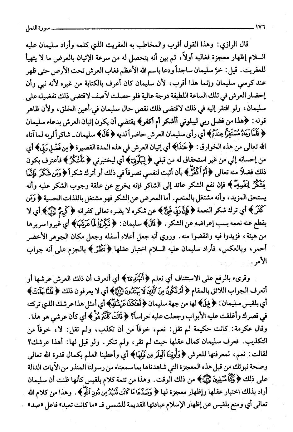 قال الرازي: وهذا القول أقرب والمخاطب به العفريت الذي كلمه وأراد سليمان عليه السلام إظهار معجزة فغالبه أولا، ثم بين أنه يتحصل له من سرعة الإتيان بالعرض ما لا يتهيأ للعفريت. قيل: خرّ سليمان ساجدا ودعا باسم الله الأعظم فغاب العرش تحت الأرض حتى ظهر عند كرسي سليمان وإنما هذا أقرب، لأن سليمان كان أعرف بالكتابة من غيره لأنه نبي وأن إحضار العرش في تلك الساعة اللطيفة درجة عالية فلو حصلت لآصف لاقتضى ذلك تفضيله على سليمان، ولو افتقر إليه في ذلك لاقتضى ذلك نقص حال سليمان في أعين الخلق، ولأن ظاهر قوله: هذا مِنْ فَضْلِ رَبِّي لِيَبْلُوَنِي أَأَشْكُرُ أَمْ أَكْفُرُ يقتضي أن يكون إتيان العرش بدعاء سليمان فَلَمَّا رَآهُ مُسْتَقِرًّا عِنْدَهُ أي رأى سليمان العرش حاضرا لديه قالَ سليمان- شاكرا لربه لما آتاه الله تعالى من هذه الخوارق: هذا أي إتيان العرش في هذه المدة القصيرة مِنْ فَضْلِ رَبِّي أي من إحسانه إلي من غير استحقاق له من قبلي لِيَبْلُوَنِي أي ليختبرني أَأَشْكُرُ فأعترف بكون ذلك فضلا منه تعالى أَمْ أَكْفُرُ بأن أثبت لنفسي تصرفا في ذلك أو أترك شكرا وَمَنْ شَكَرَ فَإِنَّما يَشْكُرُ لِنَفْسِهِ فإن نفع الشكر عائد إلى الشاكر فإنه يخرج عن علقة وجوب الشكر عليه وأنه يستحق المزيد، وأنه مشتغل بالمنعم. أما المعرض عن الشكر فهو مشتغل باللذات الحسية وَمَنْ كَفَرَ أي ترك شكر النعمة فَإِنَّ رَبِّي غَنِيٌّ عن شكره لا يضره تعالى كفرانه كَرِيمٌ (40) أي لا يقطع عنه نعمه بسبب إعراضه عن الشكر.