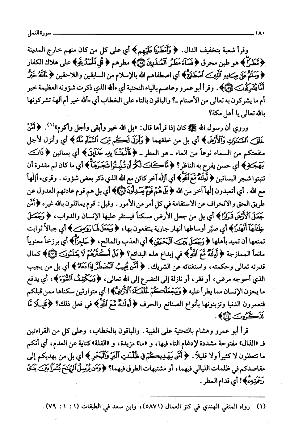 وقرأ شعبة بتخفيف الدال. وَأَمْطَرْنا عَلَيْهِمْ أي على كل من كان منهم خارج المدينة مَطَراً هو طين محرق فَساءَ مَطَرُ الْمُنْذَرِينَ (58) مطرهم قُلِ الْحَمْدُ لِلَّهِ على هلاك الكفار وَسَلامٌ عَلى عِبادِهِ الَّذِينَ اصْطَفى أي اصطفاهم الله بالإسلام من السابقين واللاحقين آللَّهُ خَيْرٌ أَمَّا يُشْرِكُونَ (59) . وقرأ أبو عمرو وعاصم بالياء التحتية أي أالله الذي ذكرت شؤونه العظيمة خير أم ما يشركون به تعالى من الأصنام-؟ والباقون بالتاء على الخطاب أي أالله خير أم آلهة تشركونها بالله تعالى يا أهل مكة؟