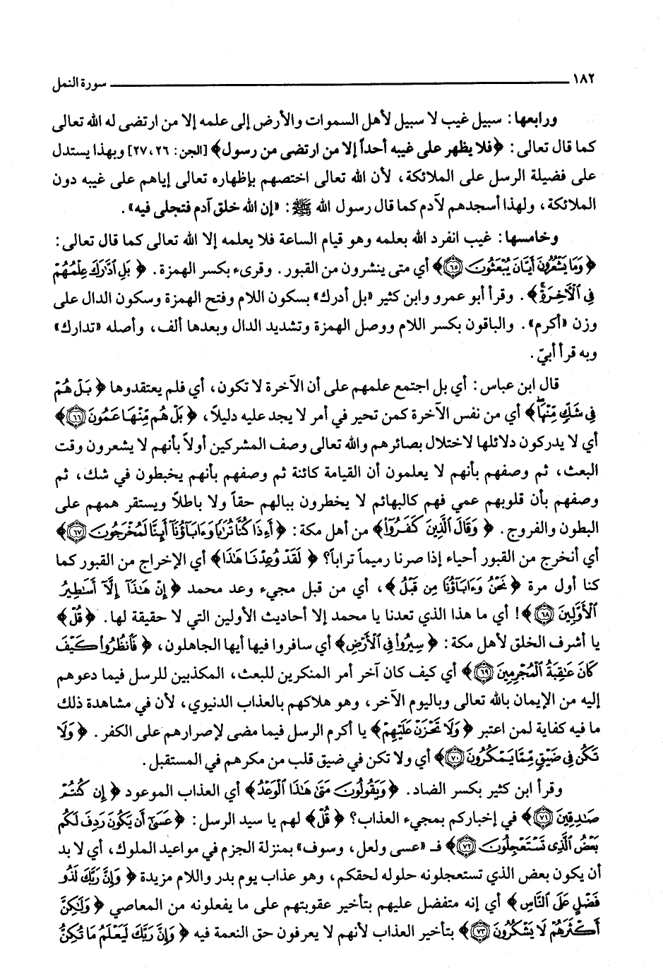 قال ابن عباس: أي بل اجتمع علمهم على أن الآخرة لا تكون، أي فلم يعتقدوها بَلْ هُمْ فِي شَكٍّ مِنْها أي من نفس الآخرة كمن تحير في أمر لا يجد عليه دليلا، بَلْ هُمْ مِنْها عَمُونَ (66) أي لا يدركون دلائلها لاختلال بصائرهم والله تعالى وصف المشركين أولا بأنهم لا يشعرون وقت البعث، ثم وصفهم بأنهم لا يعلمون أن القيامة كائنة ثم وصفهم بأنهم يخبطون في شك، ثم وصفهم بأن قلوبهم عمي فهم كالبهائم لا يخطرون ببالهم حقا ولا باطلا ويستقر همهم على البطون والفروج. وَقالَ الَّذِينَ كَفَرُوا من أهل مكة: أَإِذا كُنَّا تُراباً وَآباؤُنا أَإِنَّا لَمُخْرَجُونَ (67) أي أنخرج من القبور أحياء إذا صرنا رميما ترابا؟ لَقَدْ وُعِدْنا هذا أي الإخراج من القبور كما كنا أول مرة نَحْنُ وَآباؤُنا مِنْ قَبْلُ، أي من قبل مجيء وعد محمد إِنْ هذا إِلَّا أَساطِيرُ الْأَوَّلِينَ (68) ! أي ما هذا الذي تعدنا يا محمد إلا أحاديث الأولين التي لا حقيقة لها. قُلْ يا أشرف الخلق لأهل مكة: سِيرُوا فِي الْأَرْضِ أي سافروا فيها أيها الجاهلون، فَانْظُرُوا كَيْفَ كانَ عاقِبَةُ الْمُجْرِمِينَ (69) أي كيف كان آخر أمر المنكرين للبعث، المكذبين للرسل فيما دعوهم إليه من الإيمان بالله تعالى وباليوم الآخر، وهو هلاكهم بالعذاب الدنيوي، لأن في مشاهدة ذلك ما فيه كفاية لمن اعتبر وَلا تَحْزَنْ عَلَيْهِمْ يا أكرم الرسل فيما مضى لإصرارهم على الكفر. وَلا تَكُنْ فِي ضَيْقٍ مِمَّا يَمْكُرُونَ (70) أي ولا تكن في ضيق قلب من مكرهم في المستقبل.