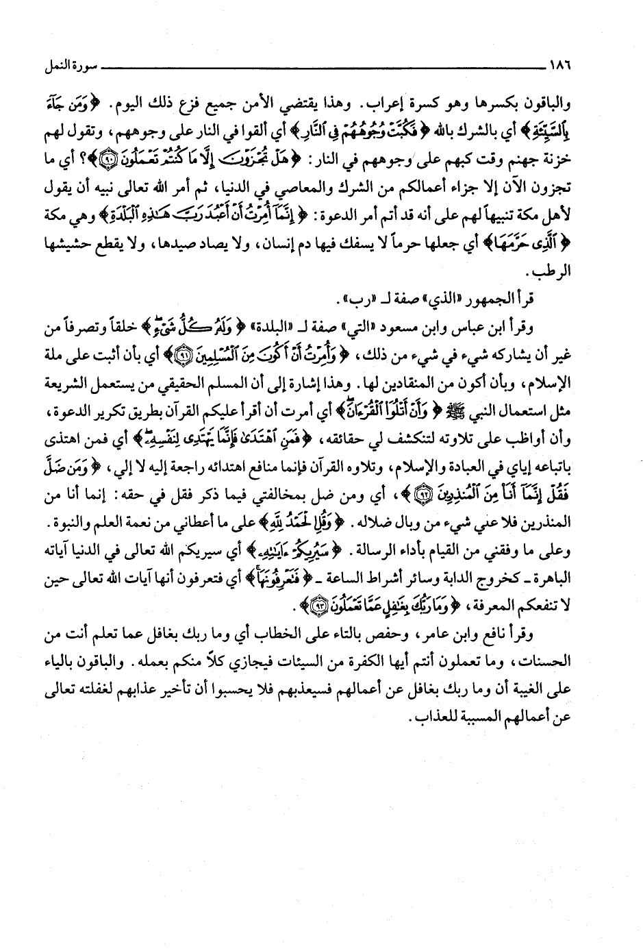 وقرأ ابن عباس وابن مسعود «التي» صفة ل «البلدة» وَلَهُ كُلُّ شَيْءٍ خلقا وتصرفا من غير أن يشاركه شيء في شيء من ذلك، وَأُمِرْتُ أَنْ أَكُونَ مِنَ الْمُسْلِمِينَ (91) أي بأن أثبت على ملة الإسلام، وبأن أكون من المنقادين لها. وهذا إشارة إلى أن المسلم الحقيقي من يستعمل الشريعة مثل استعمال النبي صلّى الله عليه وسلّم وَأَنْ أَتْلُوَا الْقُرْآنَ أي أمرت أن أقرأ عليكم القرآن بطريق تكرير الدعوة، وأن أواظب على تلاوته لتنكشف لي حقائقه، فَمَنِ اهْتَدى فَإِنَّما يَهْتَدِي لِنَفْسِهِ أي فمن اهتذى باتباعه إياي في العبادة والإسلام، وتلاوة القرآن فإنما منافع اهتدائه راجعة إليه لا إلي، وَمَنْ ضَلَّ فَقُلْ إِنَّما أَنَا مِنَ الْمُنْذِرِينَ (92) ، أي ومن ضل بمخالفتي فيما ذكر فقل في حقه: إنما أنا من المنذرين فلا علي شيء من وبال ضلاله. وَقُلِ الْحَمْدُ لِلَّهِ على ما أعطاني من نعمة العلم والنبوة.