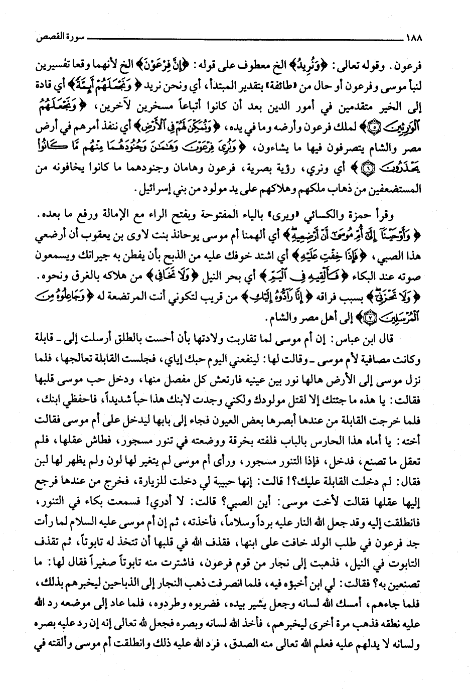 فرعون. وقوله تعالى: وَنُرِيدُ إلخ معطوف على قوله: إِنَّ فِرْعَوْنَ إلخ لأنهما وقعا تفسيرين لنبأ موسى وفرعون أو حال من «طائفة» بتقدير المبتدأ، أي ونحن نريد وَنَجْعَلَهُمْ أَئِمَّةً أي قادة إلى الخير متقدمين في أمور الدين بعد أن كانوا أتباعا مسخرين لآخرين، وَنَجْعَلَهُمُ الْوارِثِينَ (5) لملك فرعون وأرضه وما في يده، وَنُمَكِّنَ لَهُمْ فِي الْأَرْضِ أي ننفذ أمرهم في أرض مصر والشام يتصرفون فيها ما يشاءون، وَنُرِيَ فِرْعَوْنَ وَهامانَ وَجُنُودَهُما مِنْهُمْ ما كانُوا يَحْذَرُونَ (6) أي ونري، رؤية بصرية، فرعون وهامان وجنودهما ما كانوا يخافونه من المستضعفين من ذهاب ملكهم وهلاكهم على يد مولود من بني إسرائيل.