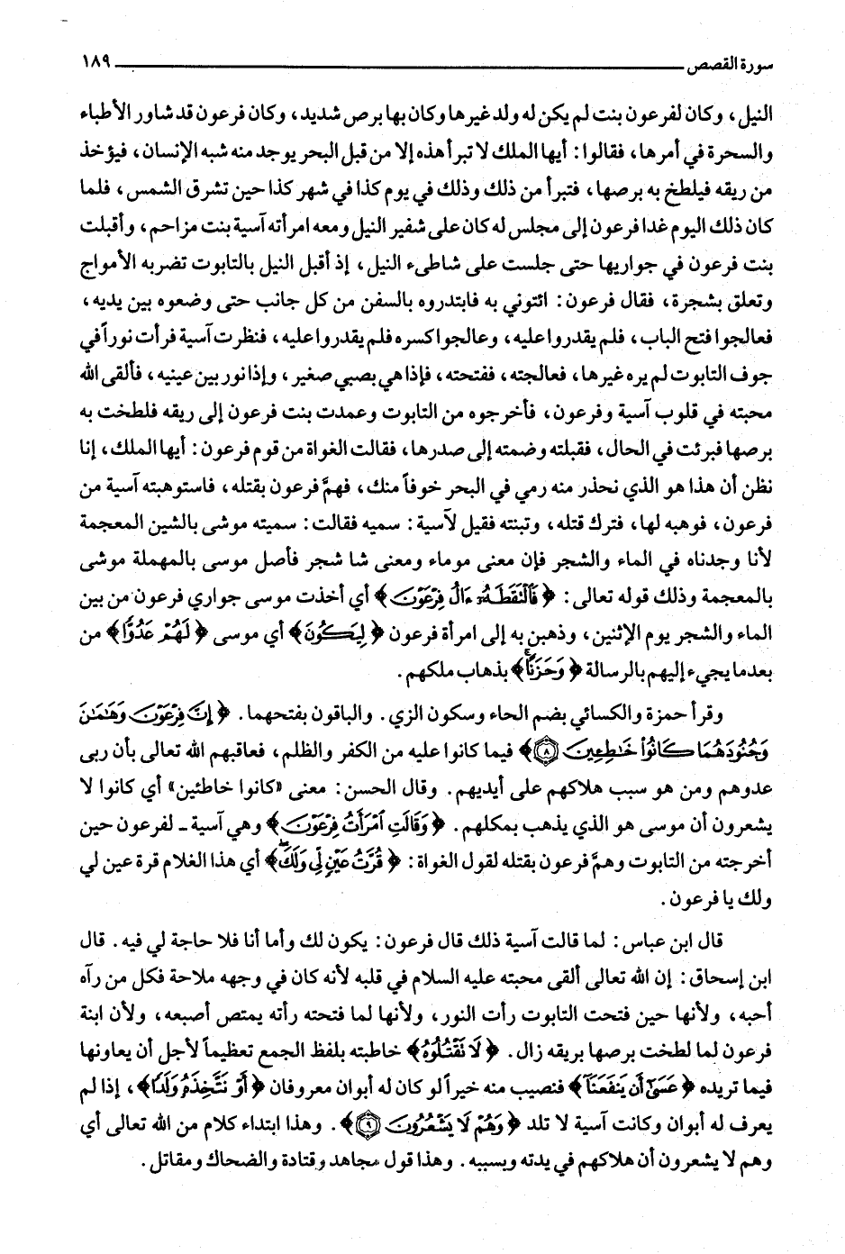 قال ابن عباس: لما قالت آسية ذلك قال فرعون: يكون لك وأما أنا فلا حاجة لي فيه. قال ابن إسحاق: إن الله تعالى ألقى محبته عليه السلام في قلبه لأنه كان في وجهه ملاحة فكل من رآه أحبه، ولأنها حين فتحت التابوت رأت النور، ولأنها لما فتحته رأته يمتص إصبعه، ولأن ابنة فرعون لما لطخت برصها بريقه زال. لا تَقْتُلُوهُ خاطبته بلفظ الجمع تعظيما لأجل أن يعاونها فيما تريده عَسى أَنْ يَنْفَعَنا فنصيب منه خيرا لو كان له أبوان معروفان أَوْ نَتَّخِذَهُ وَلَداً، إذا لم يعرف له أبوان وكانت آسية لا تلد وَهُمْ لا يَشْعُرُونَ (9) . وهذا ابتداء كلام من الله تعالى أي وهم لا يشعرون أن هلاكهم في يده وبسببه. وهذا قول مجاهد وقتادة والضحاك ومقاتل.
