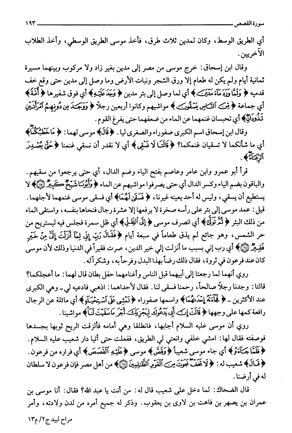 وقال ابن إسحاق: خرج موسى من مصر إلى مدين بغير زاد ولا مركوب وبينهما مسيرة ثمانية أيام ولم يكن له طعام إلا ورق الشجر ونبات الأرض وما وصل إلى مدين حتى وقع خف قدميه وَلَمَّا وَرَدَ ماءَ مَدْيَنَ أي لما وصل إلى بئر مدين وَجَدَ عَلَيْهِ أي فوق شفيرها أُمَّةً أي جماعة مِنَ النَّاسِ يَسْقُونَ مواشيهم وكانوا أربعين رجلا
