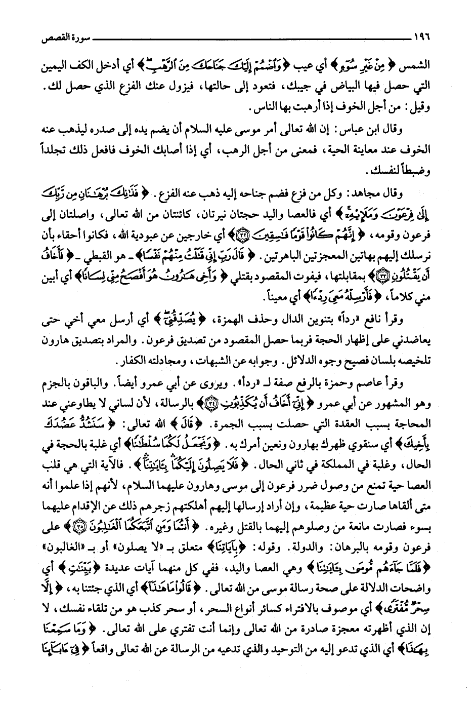وقرأ عاصم وحمزة بالرفع صفة ل «ردأ» . ويروى عن أبي عمرو أيضا. والباقون بالجزم وهو المشهور عن أبي عمرو إِنِّي أَخافُ أَنْ يُكَذِّبُونِ (34) بالرسالة، لأن لساني لا يطاوعني عند المحاجة بسبب العقدة التي حصلت بسبب الجمرة. قالَ الله تعالى: سَنَشُدُّ عَضُدَكَ بِأَخِيكَ أي سنقوي ظهرك بهارون ونعين أمرك به. وَنَجْعَلُ لَكُما سُلْطاناً أي غلبة بالحجة في الحال، وغلبة في المملكة في ثاني الحال. فَلا يَصِلُونَ إِلَيْكُما بِآياتِنا. فالآية التي هي قلب العصاحية تمنع من وصول ضرر فرعون إلى موسى وهارون عليهما السلام، لأنهم إذا علموا أنه متى ألقاها صارت حية عظيمة، وإن أراد إرسالها إليهم أهلكتهم زجرهم ذلك عن الإقدام عليهما بسوء فصارت مانعة من وصولهم إليهما بالقتل وغيره. أَنْتُما وَمَنِ اتَّبَعَكُمَا الْغالِبُونَ (35) على فرعون وقومه بالبرهان: والدولة. وقوله: بِآياتِنا متعلق ب «لا يصلون» أو ب «الغالبون» فَلَمَّا جاءَهُمْ مُوسى بِآياتِنا وهي العصا واليد، ففي كل منهما آيات عديدة بَيِّناتٍ أي واضحات الدلالة على صحة رسالة موسى من الله تعالى. قالُوا ما هذا أي الذي جئتنا به، إِلَّا سِحْرٌ مُفْتَرىً أي موصوف بالافتراء كسائر أنواع السحر، أو سحر كذب هو من تلقاء نفسك، لا إن الذي أظهرته معجزة صادرة من الله تعالى وإنما أنت تفتري على الله تعالى. وَما سَمِعْنا بِهذا أي الذي تدعو إليه من التوحيد والذي تدعيه من الرسالة عن الله تعالى واقعا فِي آبائِنَا
