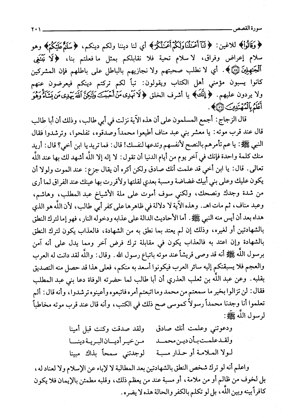 وَقالُوا للاغين: لَنا أَعْمالُنا وَلَكُمْ أَعْمالُكُمْ أي لنا ديننا ولكم دينكم، سَلامٌ عَلَيْكُمْ وهو سلام إعراض وفراق، لا سلام تحية فلا نقابلكم بمثل ما فعلتم بنا، لا نَبْتَغِي الْجاهِلِينَ (55) . أي لا نطلب صحبتهم ولا نجازيهم بالباطل على باطلهم فإن المشركين كانوا يسبون مؤمني أهل الكتاب ويقولون: تبا لكم تركتم دينكم فيعرضون عنهم ولا يردون عليهم. إِنَّكَ يا أشرف الخلق لا تَهْدِي مَنْ أَحْبَبْتَ وَلكِنَّ اللَّهَ يَهْدِي مَنْ يَشاءُ وَهُوَ أَعْلَمُ بِالْمُهْتَدِينَ (56) .