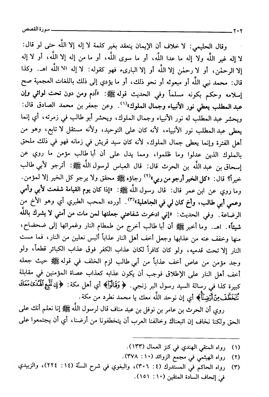 وعن جعفر بن محمد الصادق قال: ويحشر عبد المطلب له نور الأنبياء وجمال الملوك، ويحشر أبو طالب في زمرته، أي إنما يعطى عبد المطلب نور الأنبياء، لأنه كان على التوحيد، ولأنه مستقل لا تابع، وهو من أهل الفترة وإنما يعطى جمال الملوك، لأنه كان سيد قريش في زمانه فهو في ذلك ملحق بالملوك الذين عدلوا وما ظلموا