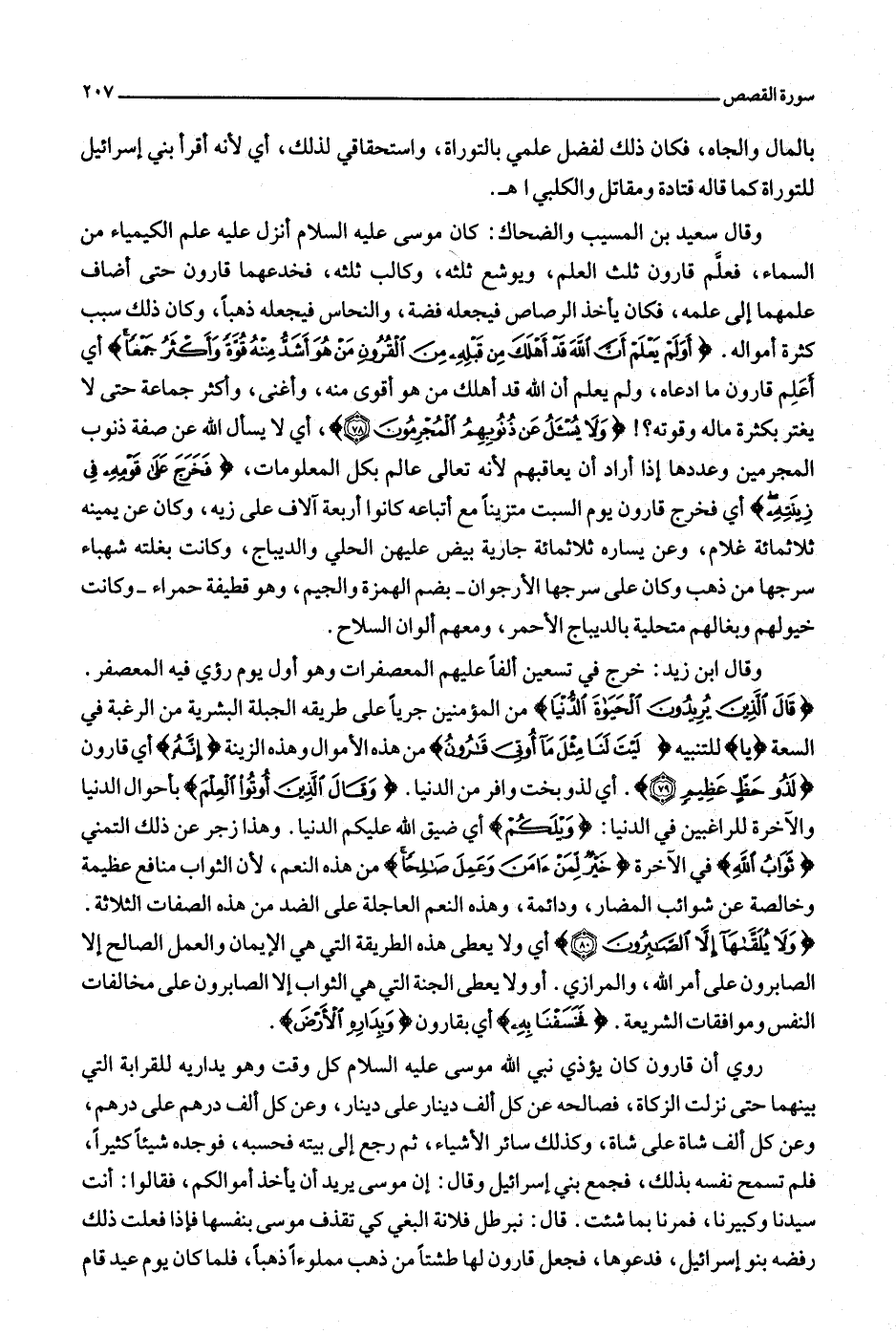 أضاف علمهما إلى علمه، فكان يأخذ الرصاص فيجعله فضة، والنحاس فيجعله ذهبا، وكان ذلك سبب كثرة أمواله. أَوَلَمْ يَعْلَمْ أَنَّ اللَّهَ قَدْ أَهْلَكَ مِنْ قَبْلِهِ مِنَ الْقُرُونِ مَنْ هُوَ أَشَدُّ مِنْهُ قُوَّةً وَأَكْثَرُ جَمْعاً أي أعلم قارون ما ادعاه، ولم يعلم أن الله قد أهلك من هو أقوى منه، وأغنى، وأكثر جماعة حتى لا يغتر بكثرة ماله وقوته؟! وَلا يُسْئَلُ عَنْ ذُنُوبِهِمُ الْمُجْرِمُونَ (78) ، أي لا يسأل الله عن صفة ذنوب المجرمين وعددها إذا أراد أن يعاقبهم لأنه تعالى عالم بكل المعلومات، فَخَرَجَ عَلى قَوْمِهِ فِي زِينَتِهِ أي فخرج قارون يوم السبت متزينا مع أتباعه كانوا أربعة آلاف على زيه، وكان عن يمينه ثلاثمائة غلام، وعن يساره ثلاثمائة جارية بيض عليهن الحلي والديباج، وكانت بغلته شهباء سرجها من ذهب وكان على سرجها الأرجوان- بضم الهمزة والجيم، وهو قطيفة حمراء- وكانت خيولهم وبغالهم متحلية بالديباج الأحمر، ومعهم ألوان السلاح.