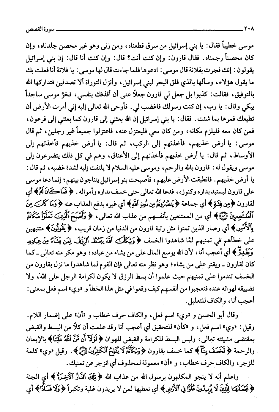 موسى خطيبا فقال: يا بني إسرائيل من سرق قطعناه، ومن زنى وهو غير محصن جلدناه، وإن كان محصنا رجمناه. فقال قارون: وإن كنت أنت؟ قال: وإن كنت أنا قال: إن بني إسرائيل يقولون: إنك فجرت بفلانة قال موسى: ادعوها فلما جاءت قال لها موسى: يا فلانة أنا فعلت بك ما يقول هؤلاء، وسألها بالذي فلق البحر لبني إسرائيل، وأنزل التوراة ألا تصدقين فتداركها الله بالتوفيق، فقالت: كذبوا بل جعل لي قارون جعلا على أن أقذفك بنفسي، فخرّ موسى ساجدا يبكي وقال: يا رب، إن كنت رسولك فاغضب لي. فأوحى الله تعالى إليه إني أمرت الأرض أن تطيعك فمرها بما شئت. فقال: يا بني إسرائيل إن الله بعثني إلى قارون كما بعثني إلى فرعون، فمن كان معه فليلزم مكانه، ومن كان معي فليعتزل عنه، فاعتزلوا جميعا غير رجلين، ثم قال موسى: يا أرض خذيهم، فأخذتهم إلى الركب، ثم قال: يا أرض خذيهم فأخذتهم إلى الأوساط، ثم قال: يا أرض خذيهم فأخذتهم إلى الأعناق، وهم في كل ذلك يتضرعون إلى موسى ويقول له: قارون بالله والرحم، وموسى عليه السلام لا يلتفت إليه لشدة غضبه، ثم قال: