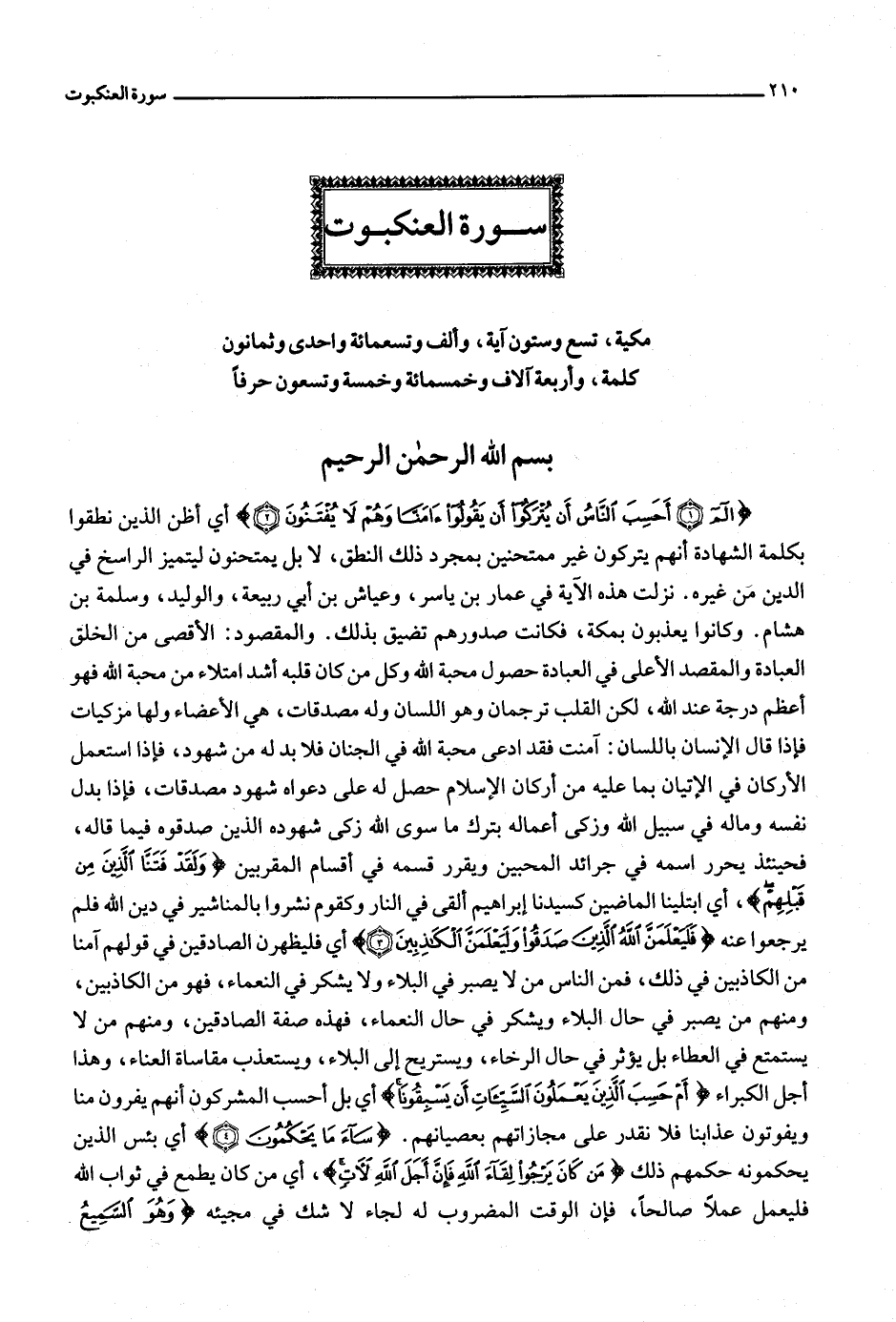 الم (1) أَحَسِبَ النَّاسُ أَنْ يُتْرَكُوا أَنْ يَقُولُوا آمَنَّا وَهُمْ لا يُفْتَنُونَ (2) أي أظن الذين نطقوا بكلمة الشهادة أنهم يتركون غير ممتحنين بمجرد ذلك النطق، لا بل يمتحنون ليتميز الراسخ في الدين من غيره. نزلت هذه الآية في عمار بن ياسر، وعياش بن أبي ربيعة، والوليد، وسلمة بن هشام. وكانوا يعذبون بمكة، فكانت صدورهم تضيق بذلك. والمقصود: الأقصى من الخلق العبادة والمقصد الأعلى في العبادة حصول محبة الله وكل من كان قلبه أشد امتلاء من محبة الله فهو أعظم درجة عند الله، لكن القلب ترجمان وهو اللسان وله مصدقات، هي الأعضاء ولها مزكيات فإذا قال الإنسان باللسان: آمنت فقد ادعى محبة الله في الجنان فلا بد له من شهود، فإذا استعمل الأركان في الإتيان بما عليه من أركان الإسلام حصل له على دعواه شهود مصدقات، فإذا بدل نفسه وماله في سبيل الله وزكى أعماله بترك ما سوى الله زكى شهوده الذين صدقوه فيما قاله، فحينئذ يحرر اسمه في جرائد المحبين ويقرر قسمه في أقسام المقربين وَلَقَدْ فَتَنَّا الَّذِينَ مِنْ قَبْلِهِمْ، أي ابتلينا الماضين كسيدنا إبراهيم ألقى في النار وكقوم نشروا بالمناشير في دين الله فلم يرجعوا عنه فَلَيَعْلَمَنَّ اللَّهُ الَّذِينَ صَدَقُوا وَلَيَعْلَمَنَّ الْكاذِبِينَ (3) أي فليظهرن الصادقين في قولهم آمنا من الكاذبين في ذلك، فمن الناس من لا يصبر في البلاء ولا يشكر في النعماء، فهو من الكاذبين، ومنهم من يصبر في حال البلاء ويشكر في حال النعماء، فهذه صفة الصادقين، ومنهم من لا يستمتع في العطاء بل يؤثر في حال الرخاء، ويستريح إلى البلاء، ويستعذب مقاساة العناء، وهذا أجل الكبراء أَمْ حَسِبَ الَّذِينَ يَعْمَلُونَ السَّيِّئاتِ أَنْ يَسْبِقُونا أي بل أحسب المشركون أنهم يفرون منا ويفوتون عذابنا فلا نقدر على مجازاتهم بعصيانهم. ساءَ ما يَحْكُمُونَ (4) أي بئس الذين يحكمونه حكمهم ذلك مَنْ كانَ يَرْجُوا لِقاءَ اللَّهِ فَإِنَّ أَجَلَ اللَّهِ لَآتٍ، أي من كان يطمع في ثواب الله فليعمل عملا صالحا، فإن الوقت المضروب له لجاء لا شك في مجيئه وَهُوَ السَّمِيعُ
