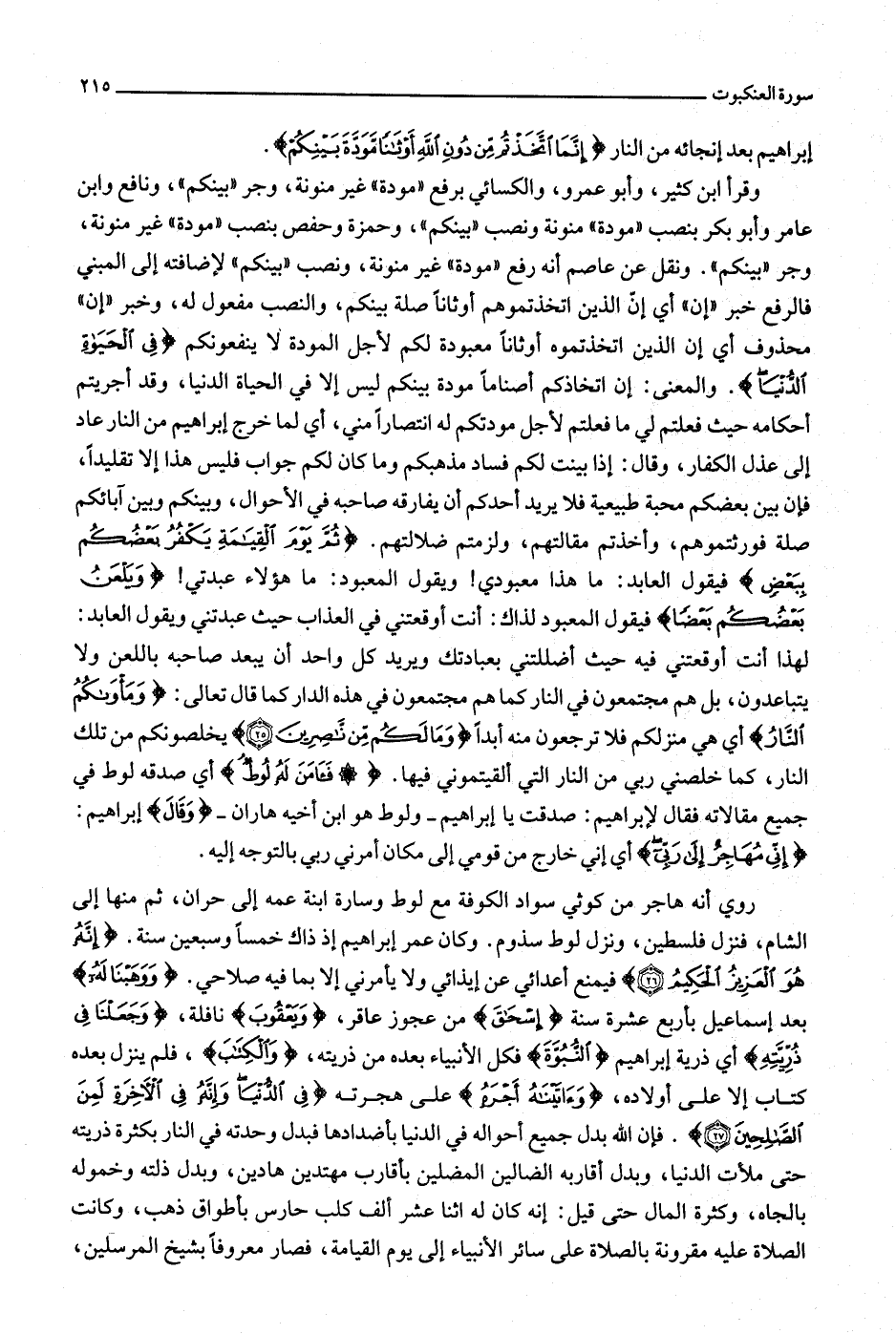 وقرأ ابن كثير، وأبو عمرو، والكسائي برفع «مودة» غير منونة، وجر «بينكم» ، ونافع وابن عامر وأبو بكر بنصب «مودة» منونة ونصب «بينكم» ، وحمزة وحفص بنصب «مودة» غير منونة، وجر «بينكم» . ونقل عن عاصم أنه رفع «مودة» غير منونة، ونصب «بينكم» لإضافته إلى المبني فالرفع خبر «إن» أي إنّ الذين اتخذتموهم أوثانا صلة بينكم، والنصب مفعول له، وخبر «إن» محذوف أي إن الذين اتخذتموه أوثانا معبودة لكم لأجل المودة لا ينفعونكم فِي الْحَياةِ الدُّنْيا. والمعنى: إن اتخاذكم أصناما مودة بينكم ليس إلا في الحياة الدنيا، وقد أجريتم أحكامه حيث فعلتم لي ما فعلتم لأجل مودتكم له انتصارا مني، أي لما خرج إبراهيم من النار عاد إلى عذل الكفار، وقال: إذا بينت لكم فساد مذهبكم وما كان لكم جواب فليس هذا إلا تقليدا، فإن بين بعضكم محبة طبيعية فلا يريد أحدكم أن يفارقه صاحبه في الأحوال، وبينكم وبين آبائكم صلة فورثتموهم، وأخذتم مقالتهم، ولزمتم ضلالتهم. ثُمَّ يَوْمَ الْقِيامَةِ يَكْفُرُ بَعْضُكُمْ بِبَعْضٍ فيقول العابد: ما هذا معبودي! ويقول المعبود: ما هؤلاء عبدتي! وَيَلْعَنُ بَعْضُكُمْ بَعْضاً فيقول المعبود لذاك: أنت أوقعتني في العذاب حيث عبدتني ويقول العابد: