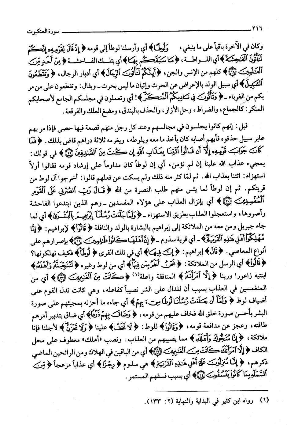 وكان في الآخرة باقيا على ما ينبغي، وَلُوطاً أي وأرسلنا لوطا إلى قومه إِذْ قالَ لِقَوْمِهِ إِنَّكُمْ لَتَأْتُونَ الْفاحِشَةَ أي اللواطة، ما سَبَقَكُمْ بِها أي بتلك الفاحشة مِنْ أَحَدٍ مِنَ الْعالَمِينَ (28) كلهم من الإنس والجن، أَإِنَّكُمْ لَتَأْتُونَ الرِّجالَ أي أدبار الرجال، وَتَقْطَعُونَ السَّبِيلَ أي سبيل الولد بالإعراض عن الحرث وإتيان ما ليس بحرث- ويقال: وتقطعون على من مر بكم من الغرباء- وَتَأْتُونَ فِي نادِيكُمُ الْمُنْكَرَ! أي وتعملون في مجلسكم الجامع لأصحابكم المنكر: كالجماع، والضراط، وحل الإزار، والحذف بالبندق، ومضغ العلك والفرقعة.
